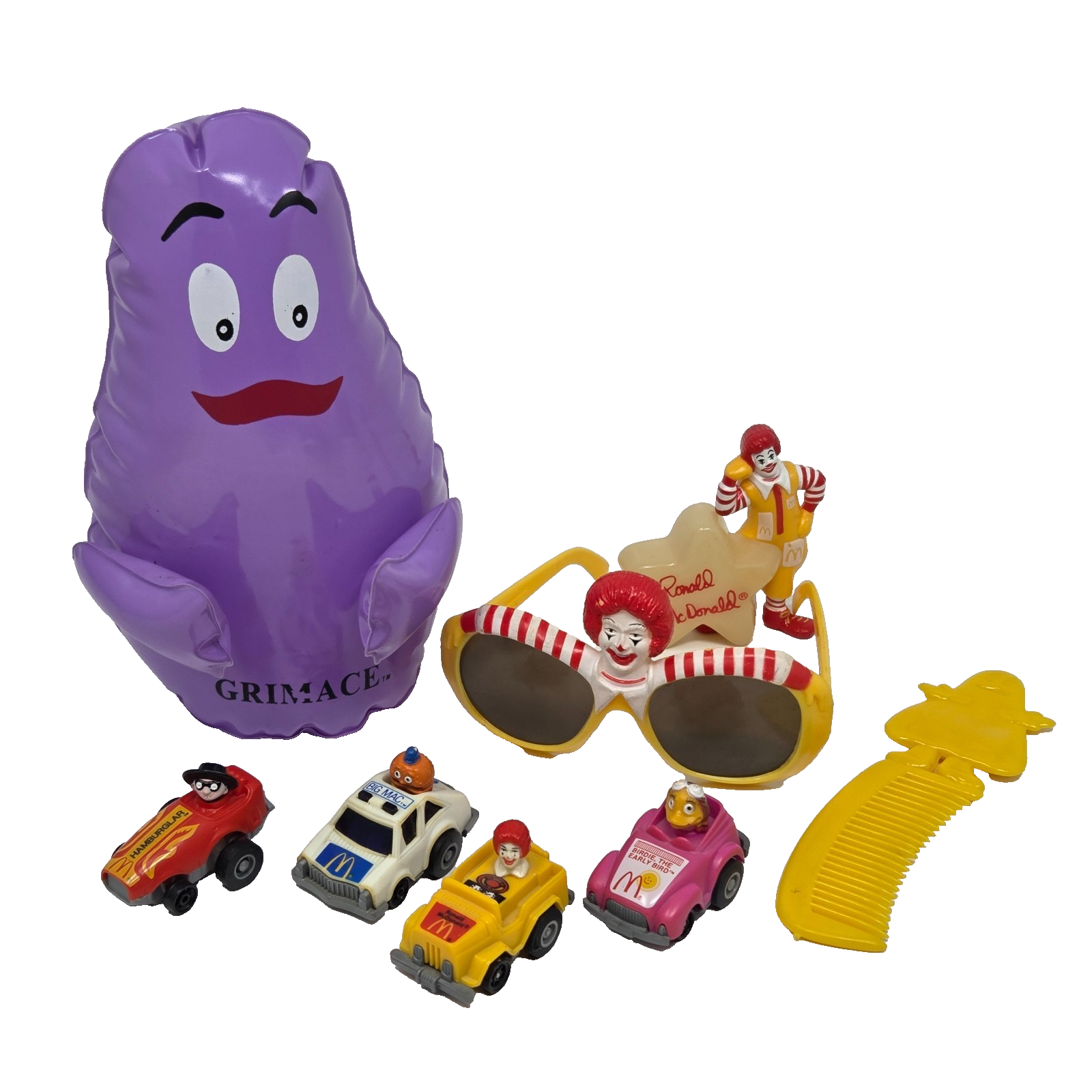 VINTAGE McDONALDS LOT OF TOYS GRIMACE INFLATABLE 4 FAST MACS RONALD GLASSES