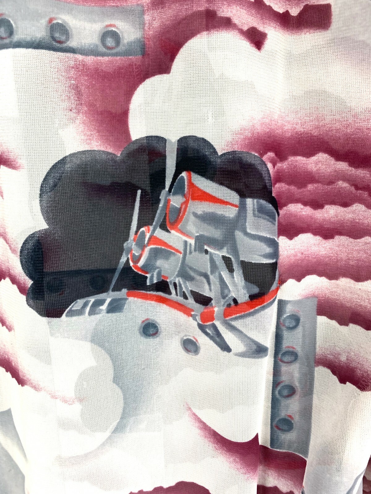 Fabric: Nylon ยท Aviation plane + cloud print ยท Pointed disco collar ยท Long sleeves ยท Button front