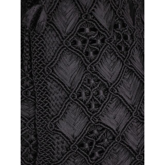Hand-crocheted ribbon with openwork chevron and diamond motifs; woven ribbon cord belt; skirt with side zipper; vest unlined.