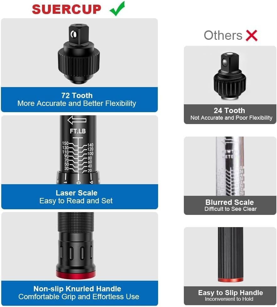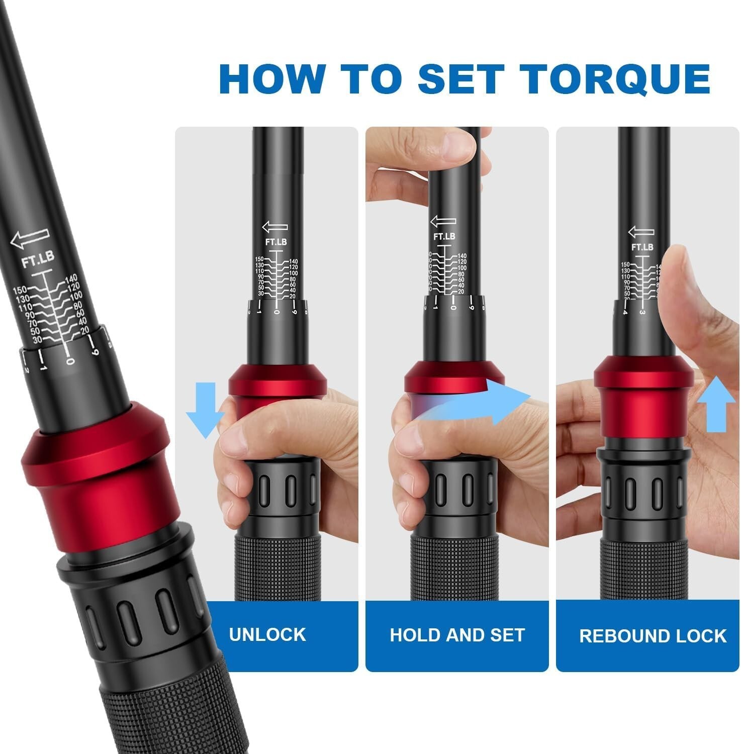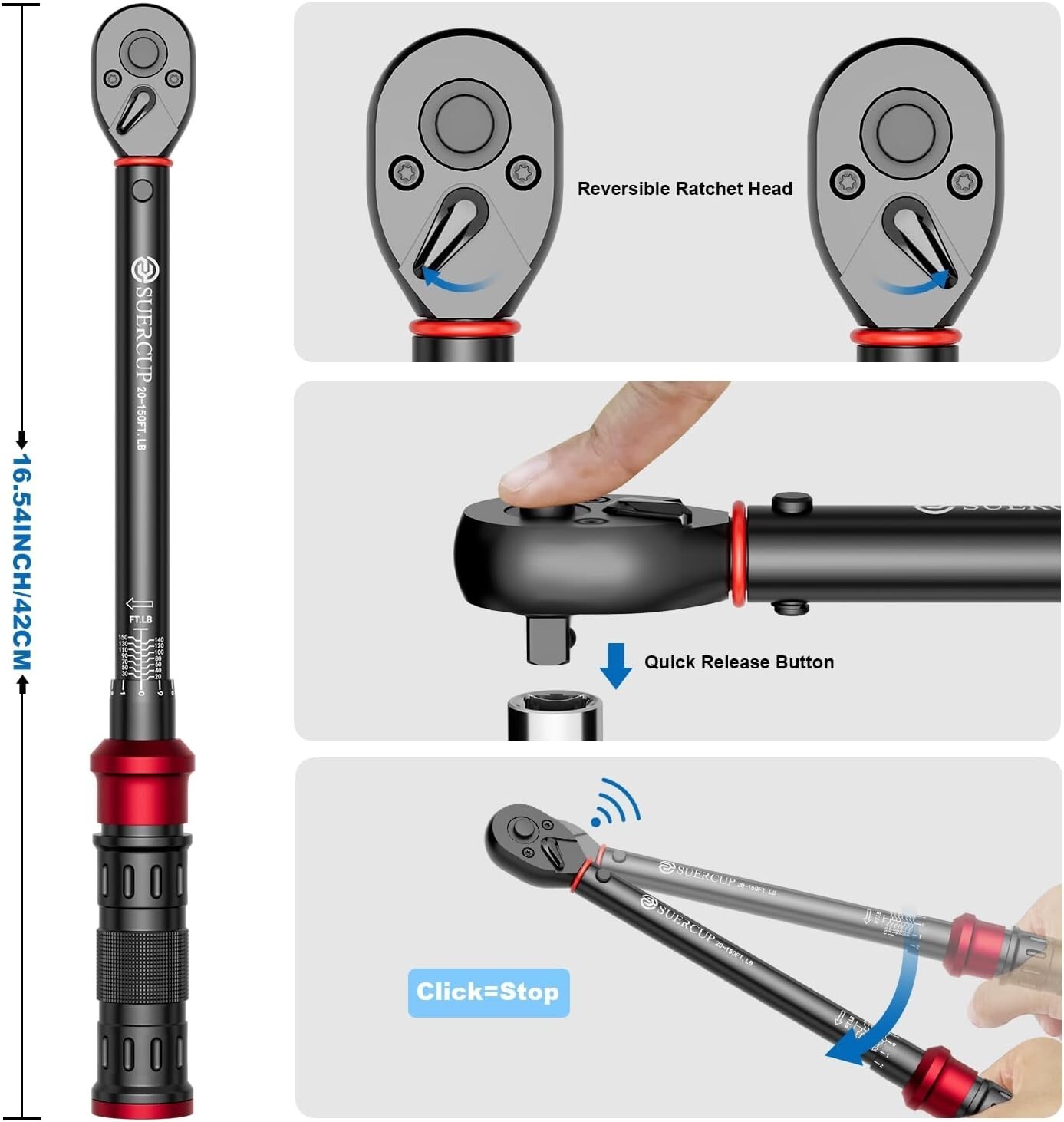 Durable 1/2-Inch Torque Wrench with Quick Setting & Click Mechanism, 20-150ft.lb