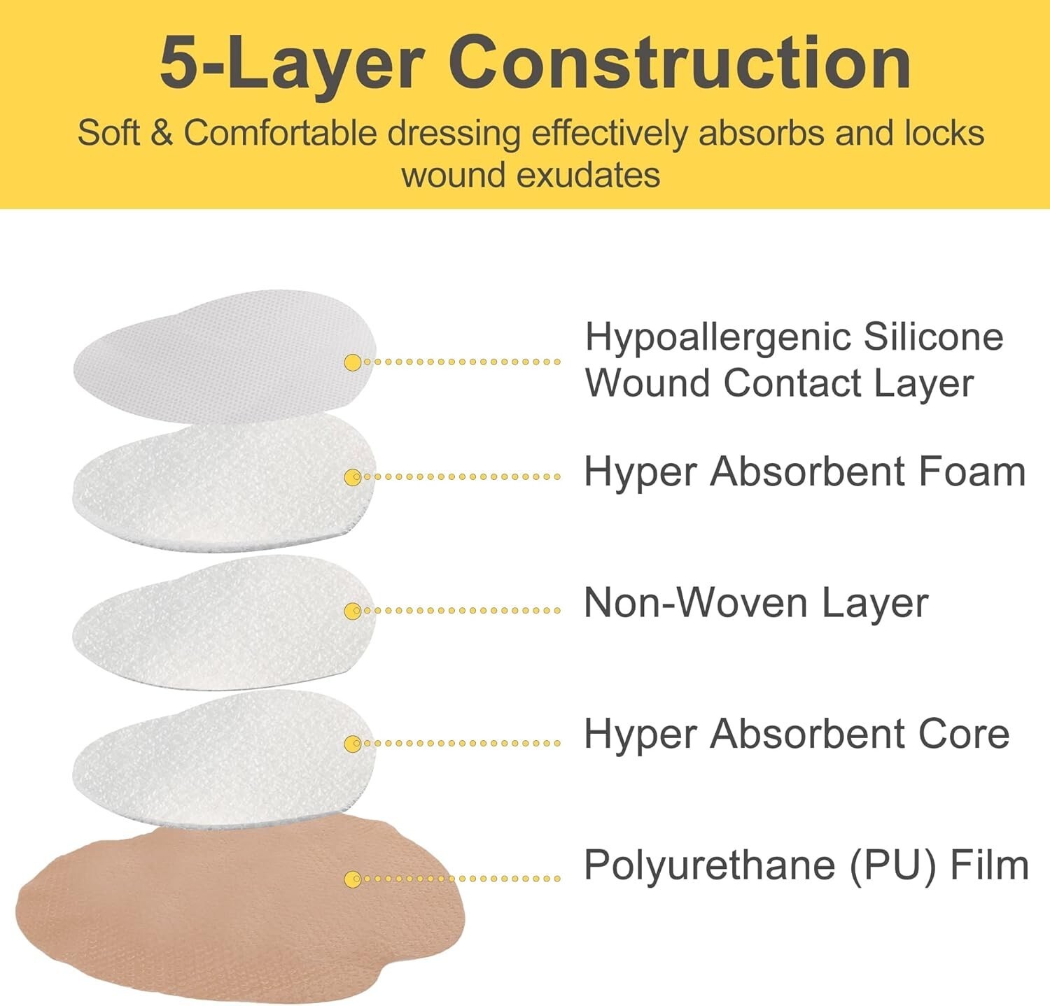 Our advanced 5-layer wound dressing combines a polyurethane film, hyper absorbent core, non-woven layer, hyper absorbent foam, and hypoallergenic silicone contact layer to promote faster healing. Designed to effectively absorb and lock in wound exudates, it maintains optimal temperature and humidity levels for optimal recovery while shielding wounds from external contaminants.