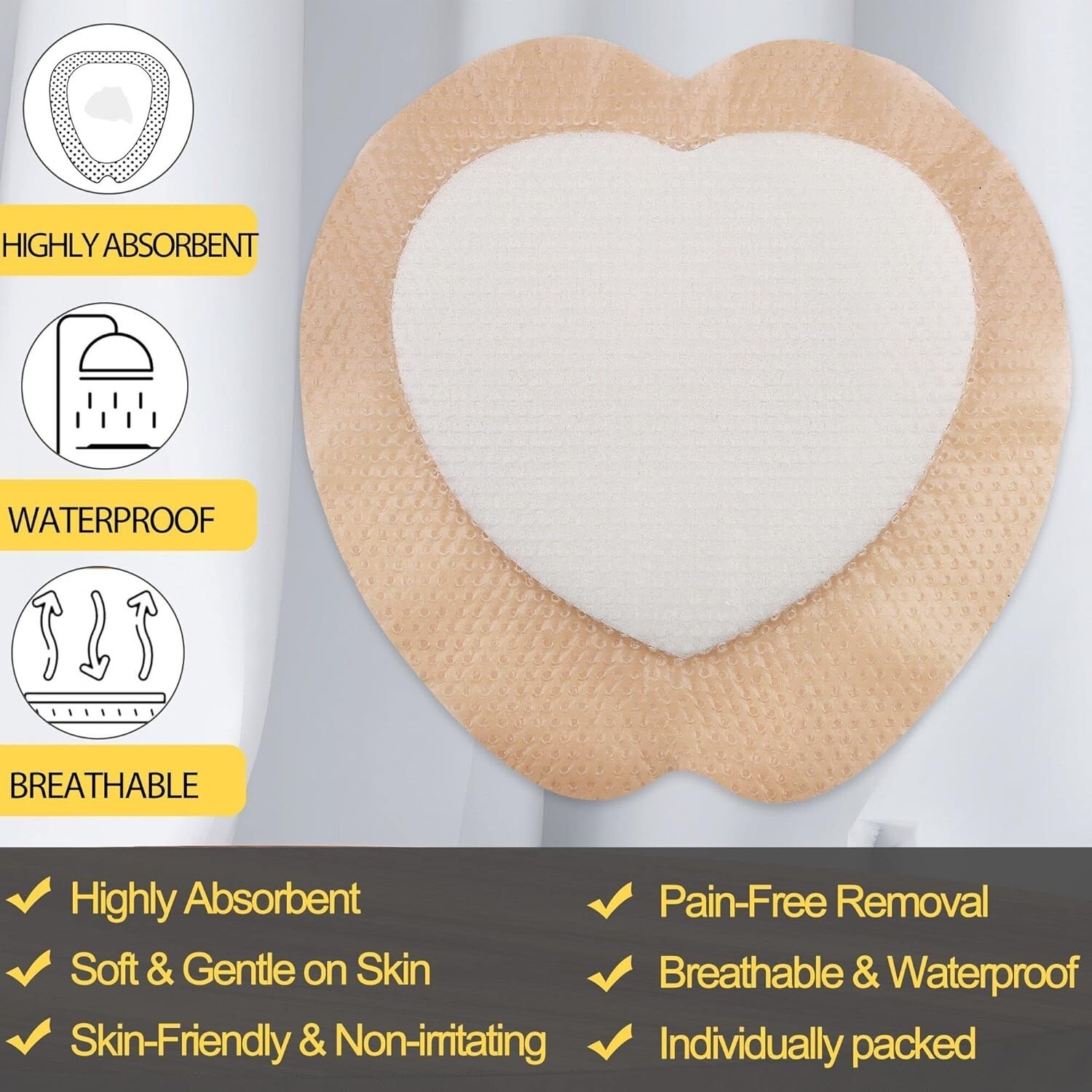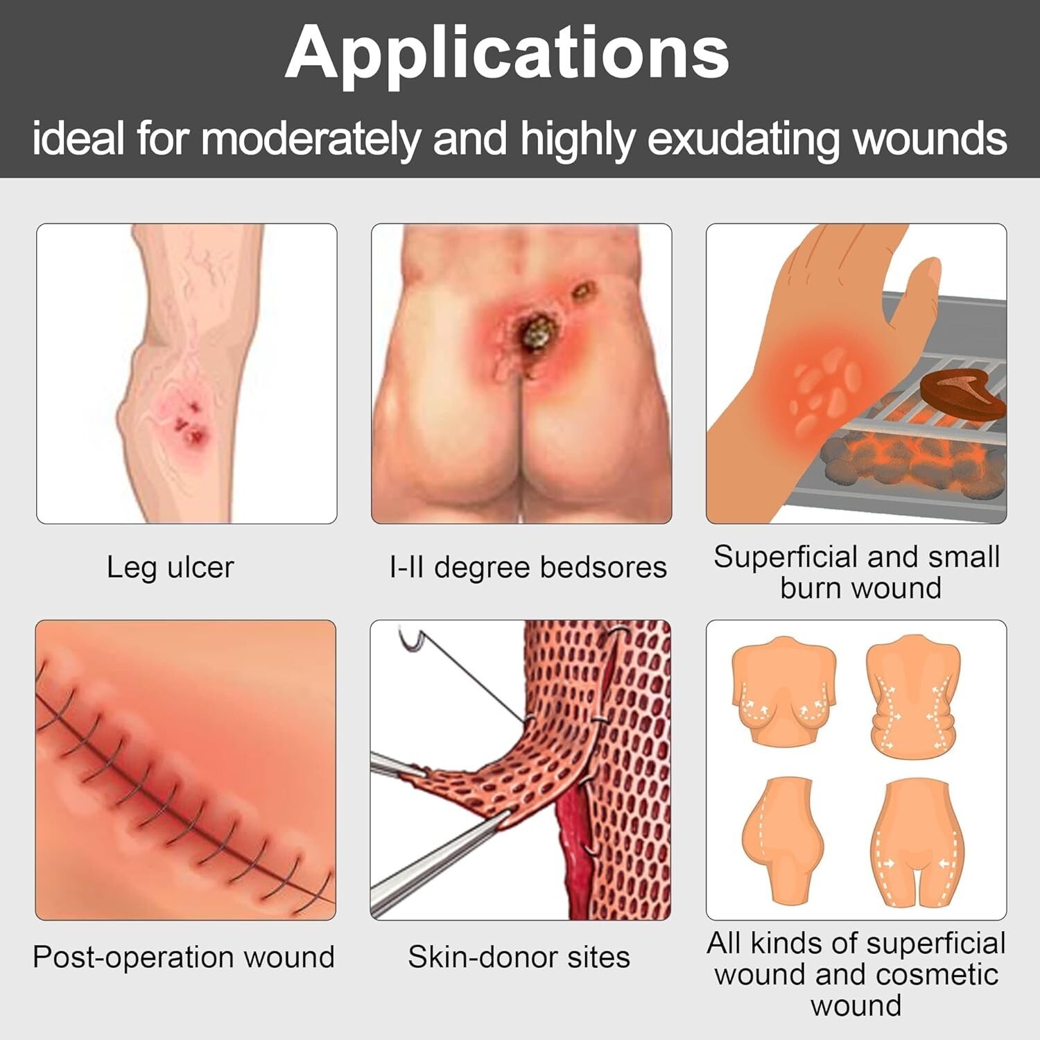 Ideal for a variety of wounds, including moderately and highly exudating wounds, post-operative sites, burns, pressure ulcers, bedsores, cysts, and other surface injuries. This latex-free, sterile, and individually wrapped dressing ensures safe application in both indoor and outdoor settings.