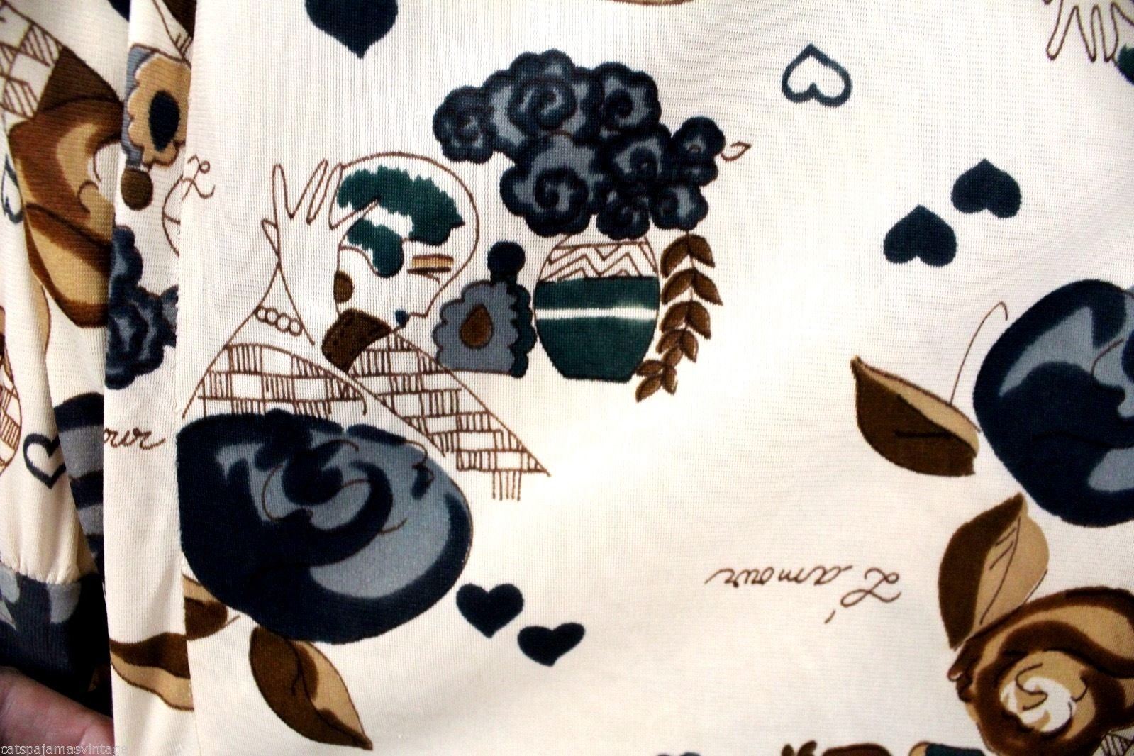 Vintage 1970s women?s disco set, comprising a long-sleeve blouse and matching tank top in slinky polyester. The bold novelty print features flapper girls, French lettering (L?amour), and retro styling ? a vibrant, playful ensemble designed for the dance floor.