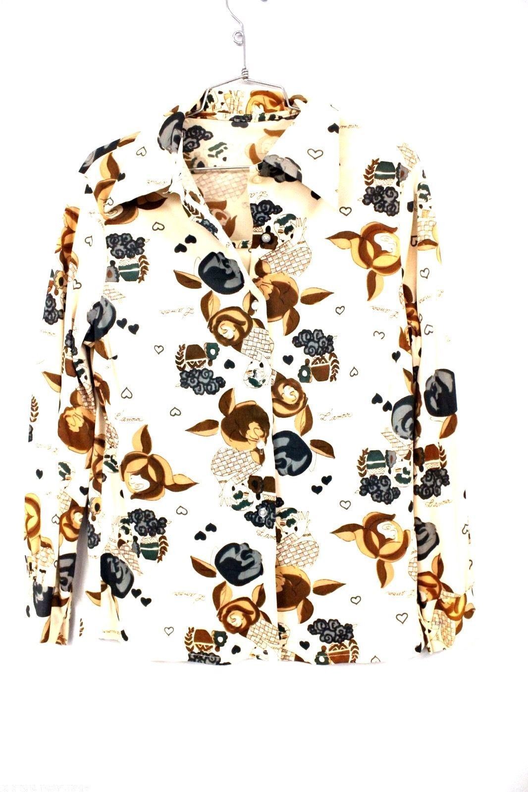 Novelty-printed polyester was a hallmark of 1970s disco fashion, with designers and home-sewers alike producing shirts in vivid patterns that reflected nightlife and pop culture. Sets like this ? particularly with themed prints ? are now rare, embodying the playful excess of the disco era.