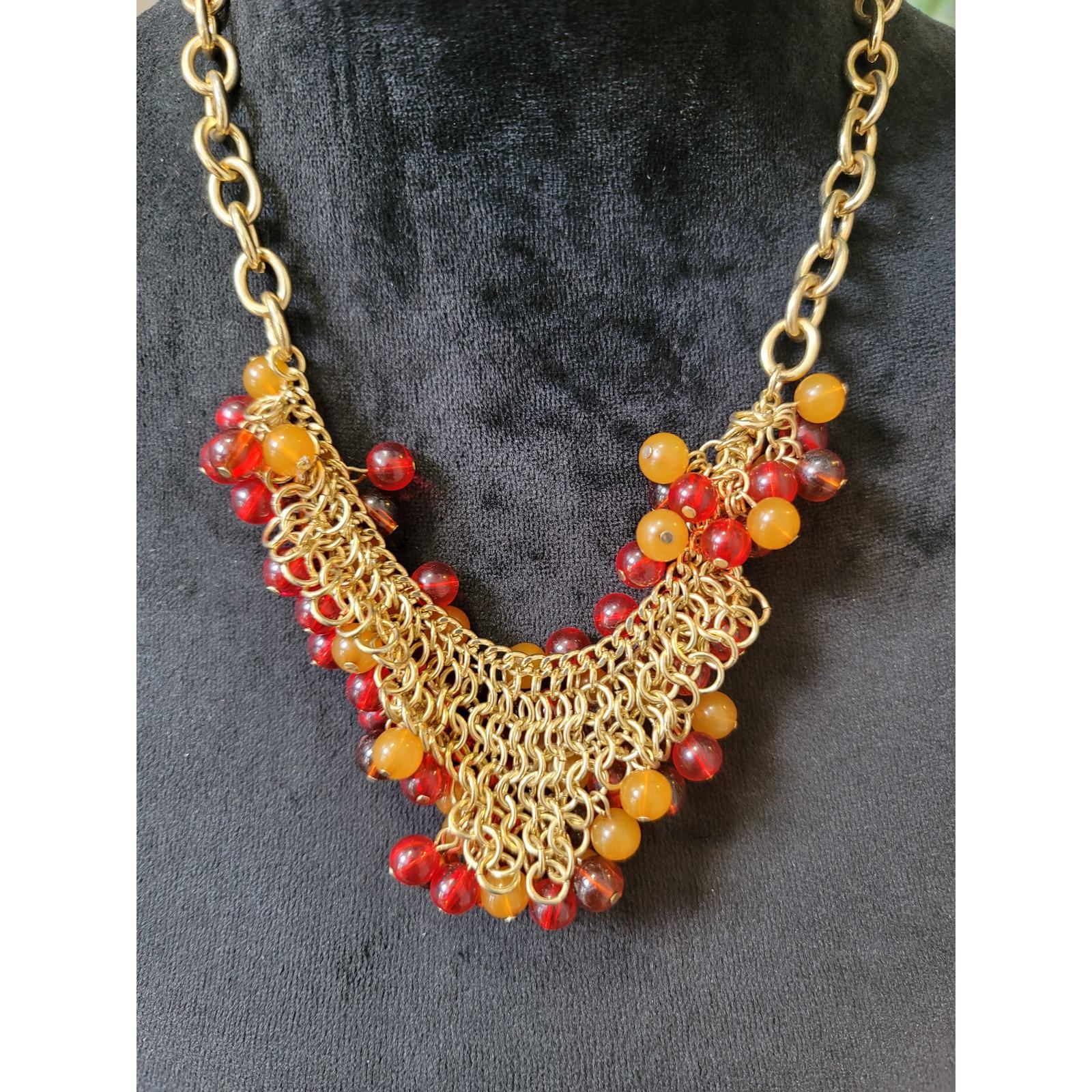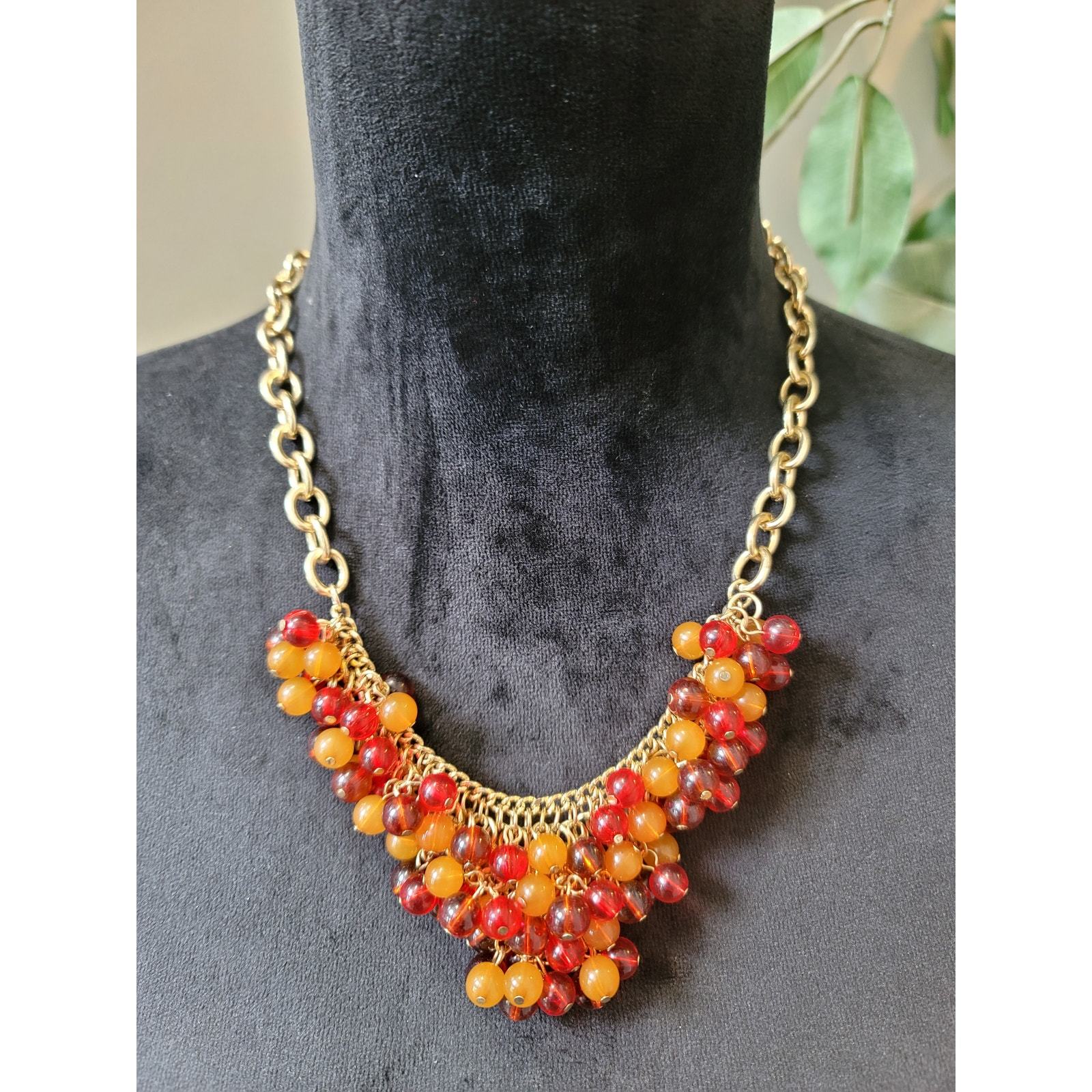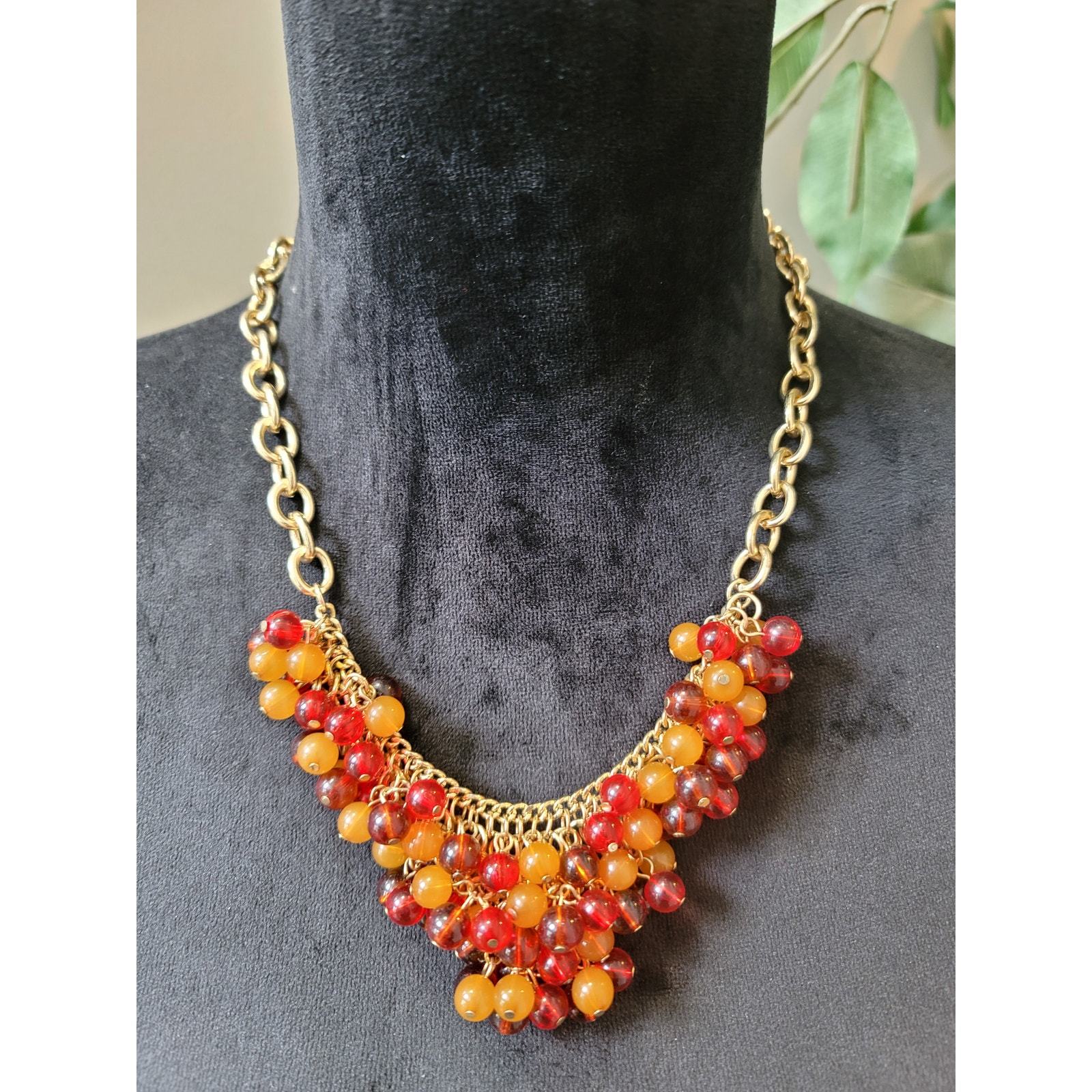 Women's Gold Statement Necklace With Red Orange Beaded Cluster And Lobster Clasp