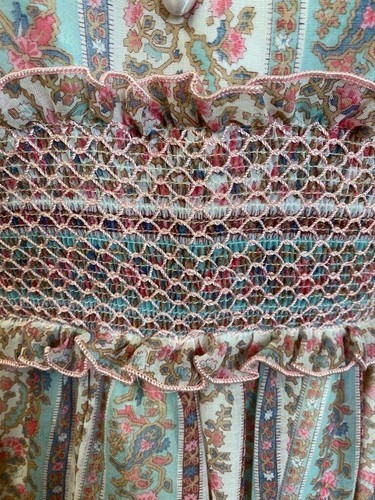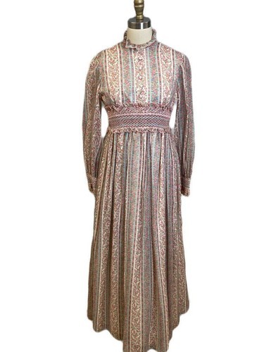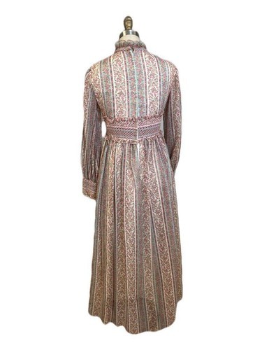 VTG 1970s Maxi Dress Pink Blue Floral Stripe Smocked Waist Victorian Revival S