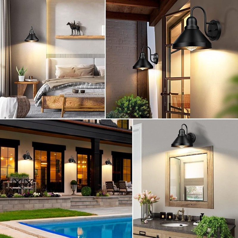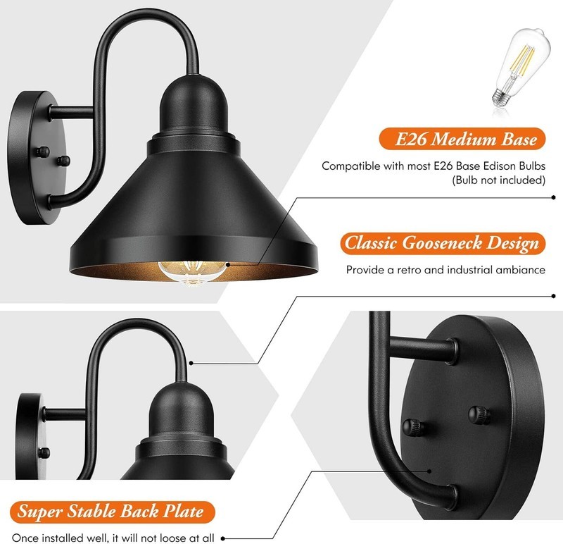 ?Simple, Stylish and Unique Design?- Except for being used exterior, these classic and popular wall-mount lamps also perfectly match the interior decor. The sleek lines, matte black finish, and swan-neck-like arms offer a minimalist look that fits in with Modern, Industrial, and Rustic decor schemes. What?s more, our barn light fixtures are compatible with all E26 socket bulbs(not included), which adds different beautiful feelings to your home.