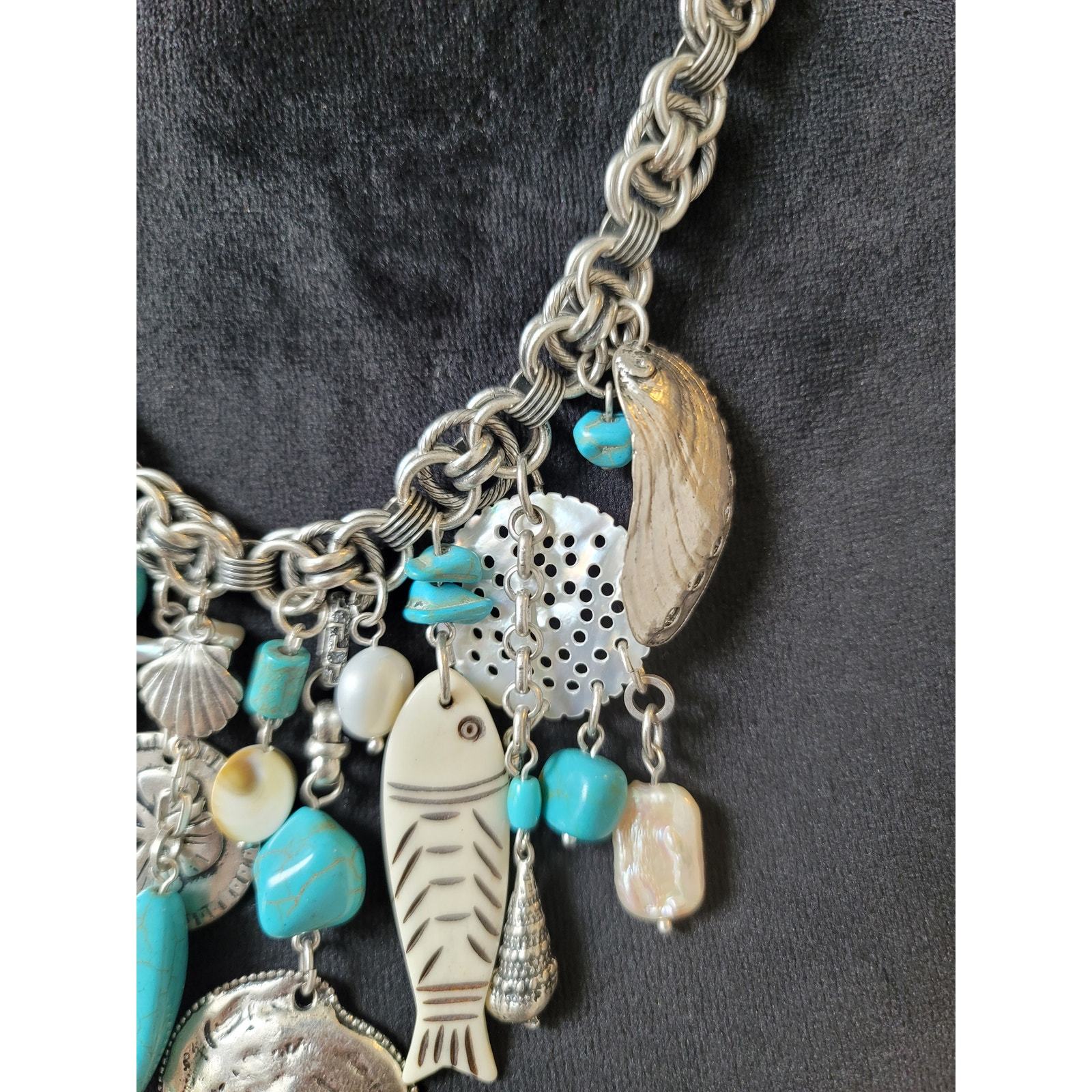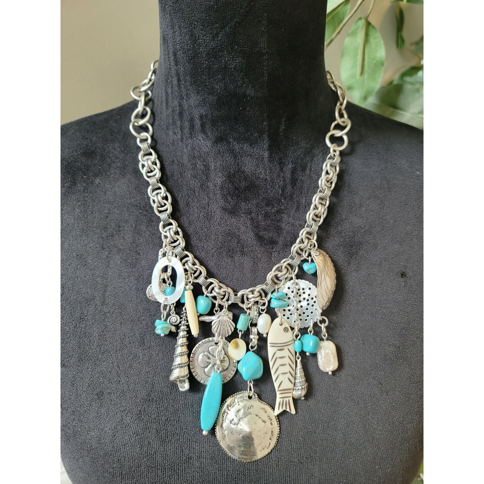 Chico's Women's Silver Tone Charm Necklace With Toggle Lock Fish Shell Beads