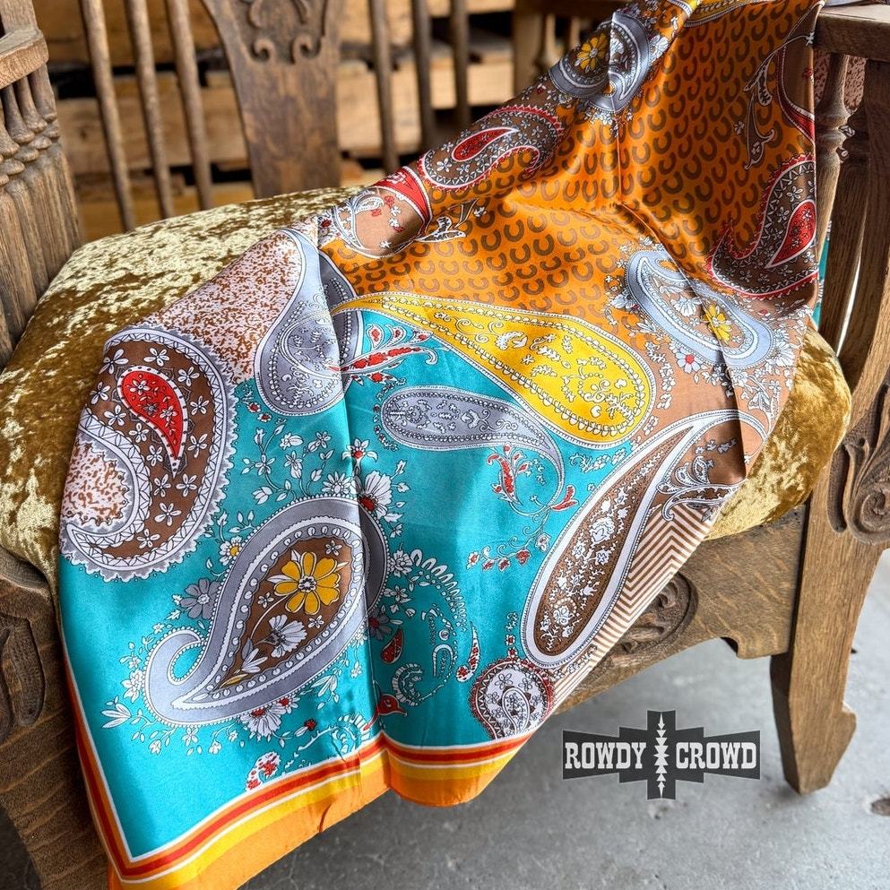 Combine retro vibes with western pleasure with our Greeley Wild Rag! It's vibrant orange, yellow, and blue complement it's paisley and horseshoe design.