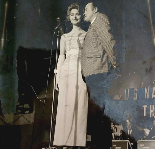 Bob Hope at an unknown USO show sometime in the 1960s with what artists to be Jill St John and the Les Brown band