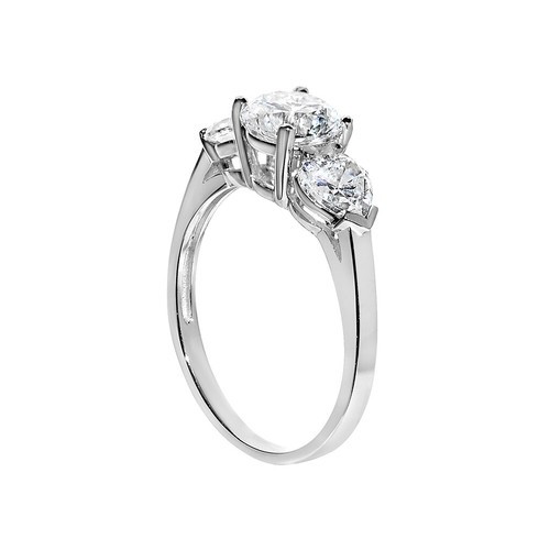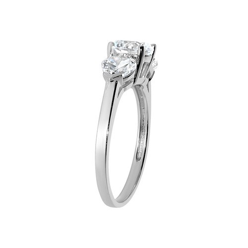 Celebrate the warmth of your love with this stunning 3-stone ring, expertly crafted in 14k white solid gold. This elegant piece features two heart-cut Diamonette stones, prong-set on either side of a brilliant round Diamonette center stone. The center Diamonette, a premium diamond simulant, shines with the brilliance equivalent to 2 carats of natural diamonds. The high-polish gold band provides a perfect backdrop, making the stones sparkle even more.