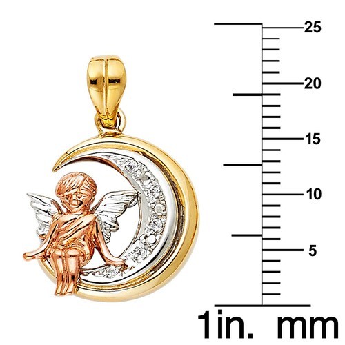 Genuine 14k Tri-tone Gold 0.70" Cubic Zirconia Angel and Moon Pendant For Women