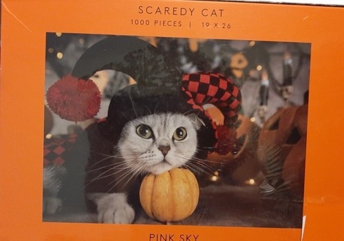 Celebrate Halloween with this brand new Pink Sky Scaredy Cat 1000-piece jigsaw puzzle. Featuring spooky black cats and a festive design, it measures 19? x 26? completed. Perfect for family fun, collectors, or as a Halloween gift.