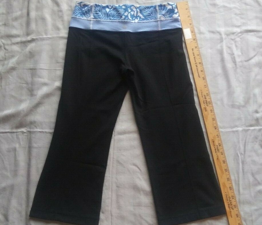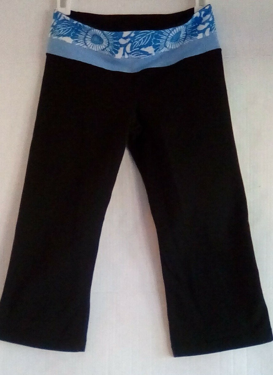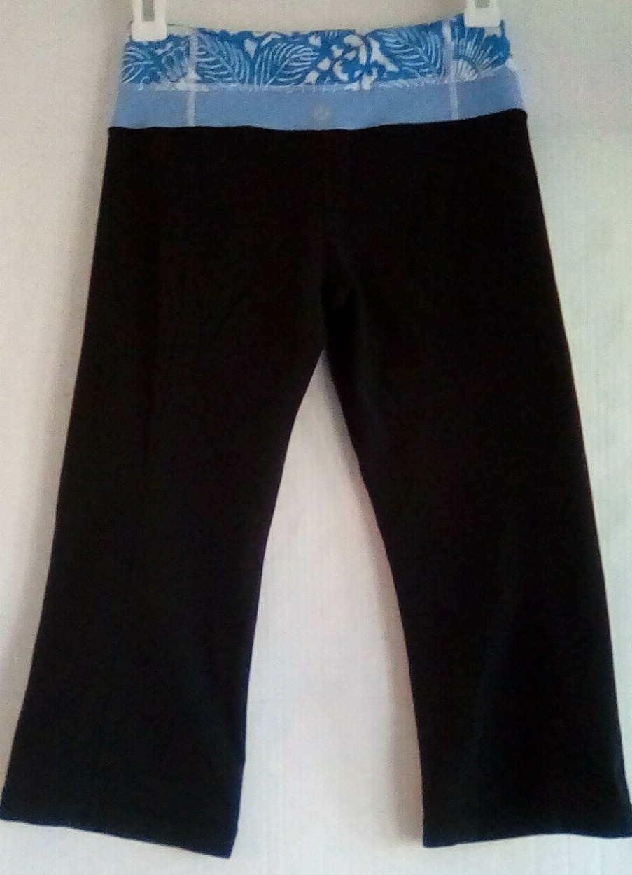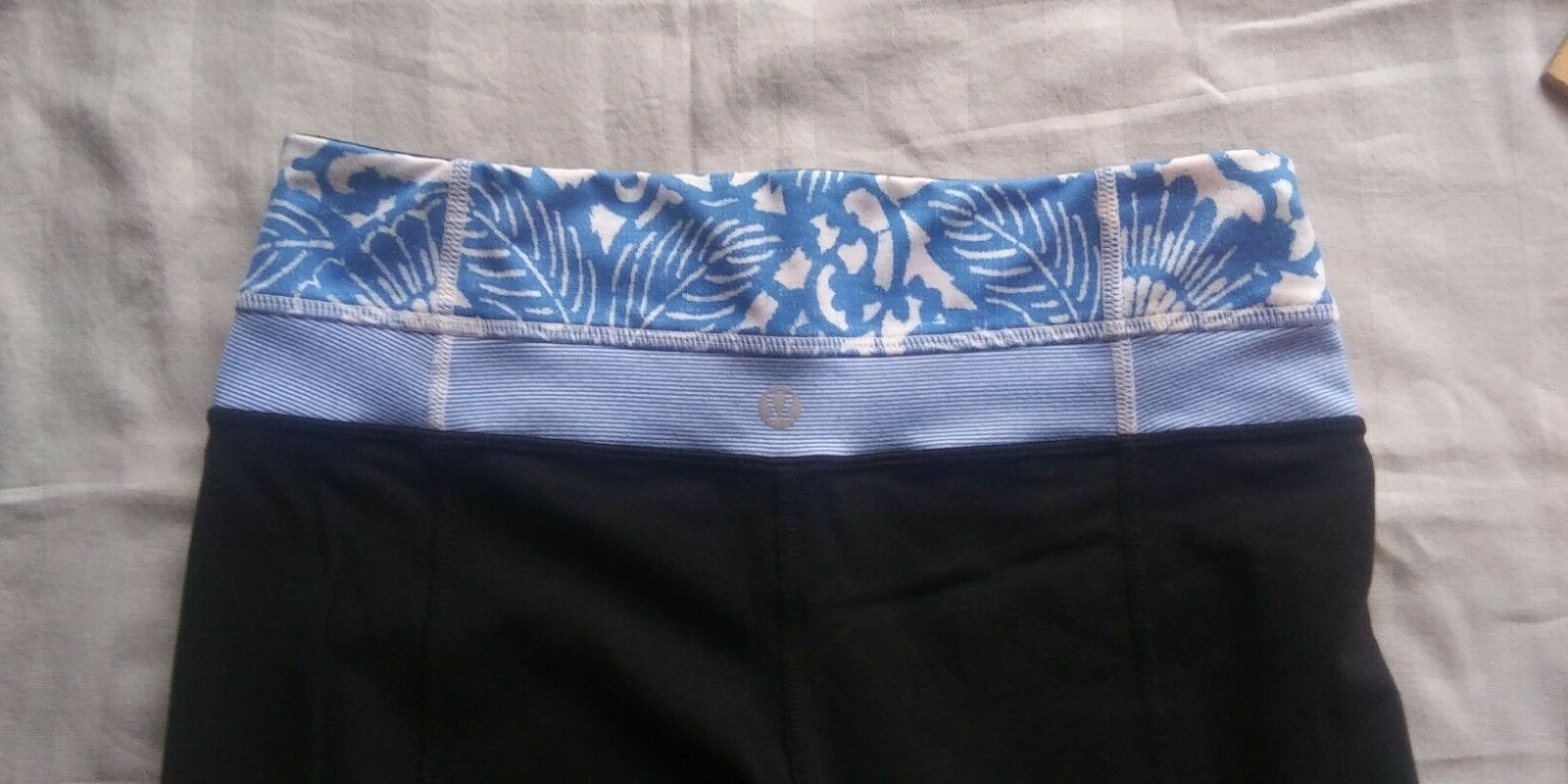 Lululemon Women Black Capri Yoga Leggings Blue Patterned Waist Band Size 4 EUC