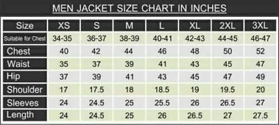 Te sugerimos; el tamaño del pecho de la chaqueta debe ser 4 pulgadas o 10 cm mas grande que el tamaño real del pecho de tu cuerpo.