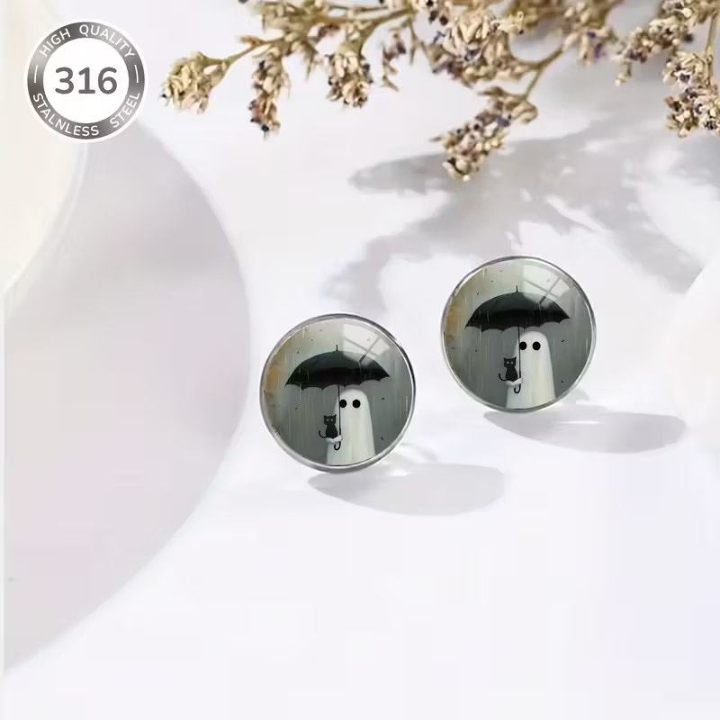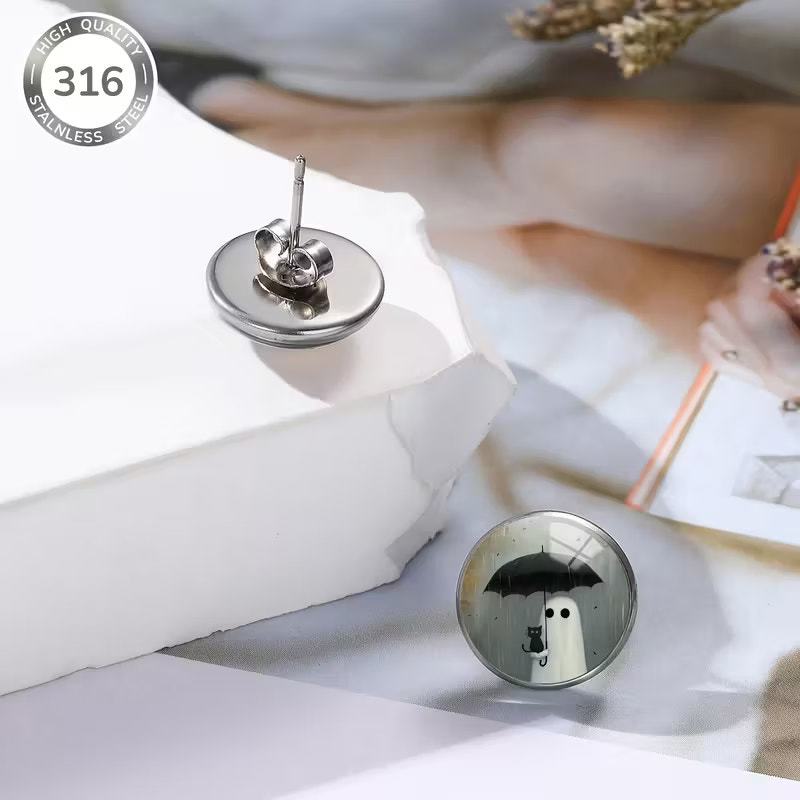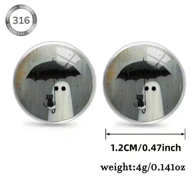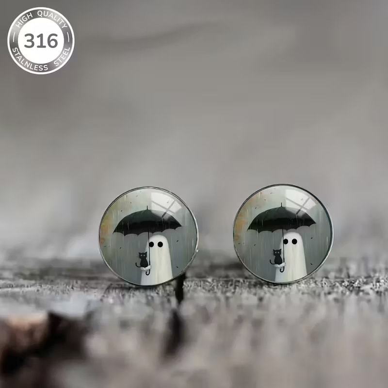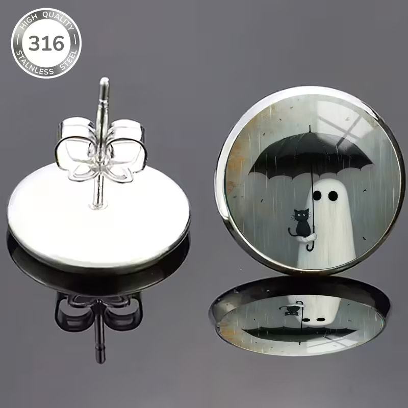 Add a touch of spooky sweetness to your style with these Ghost Cat Stud Earrings, featuring a whimsical design of a ghost holding an umbrella over a black cat in the rain. Sealed under a glossy glass dome, the high-resolution artwork pops with charm and subtle gothic flair.