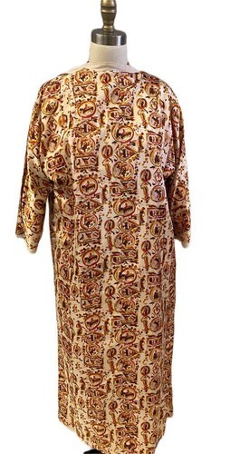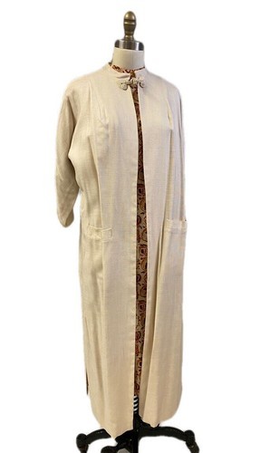 Linen with orange and gold print (dress); ivory linen coat fully lined in coordinating fabric; back metal zipper; frog closure; patch pockets; side slits.