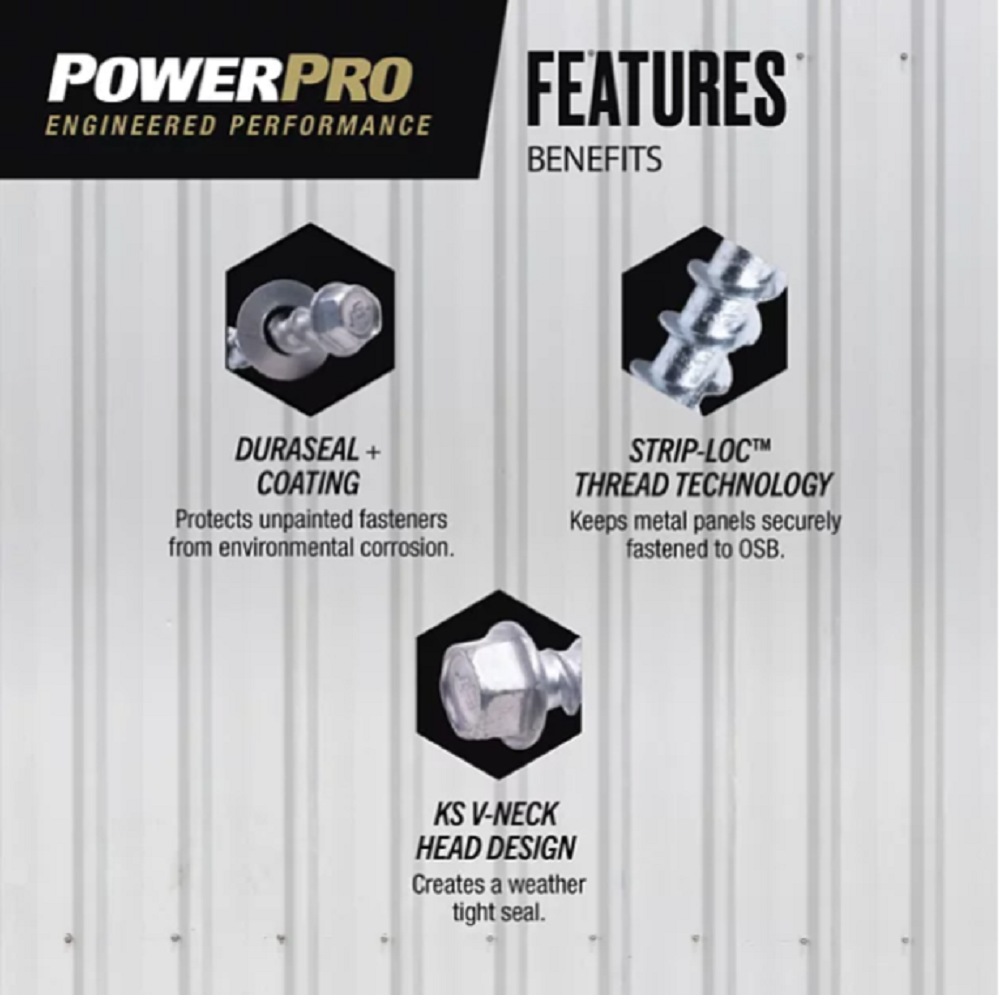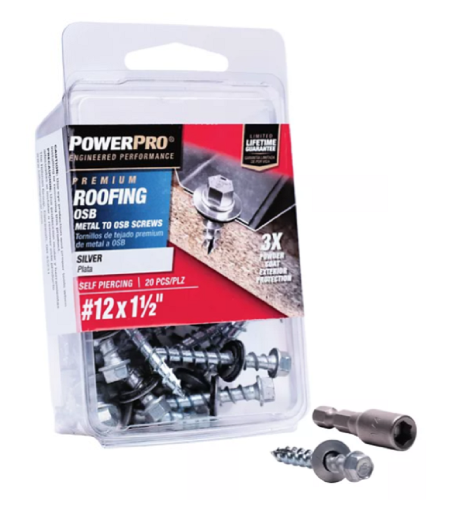 Power Pro Metal-to-OSB roofing screws designed to fasten steel roofing to wood purlins plywood or OSB. The Power Pro Silver Self-Piercing Metal-to-OSB Roofing Screw features a steel-backed EPDM rubber washer that ensures a watertight seal even when driven at an angle. Designed for exposed fastener metal roofing in 20-29 gauge applications, its powder coating enhances corrosion resistance, while the Strip-Loc thread and Type 17 Point enable quick and secure fastening to wood.