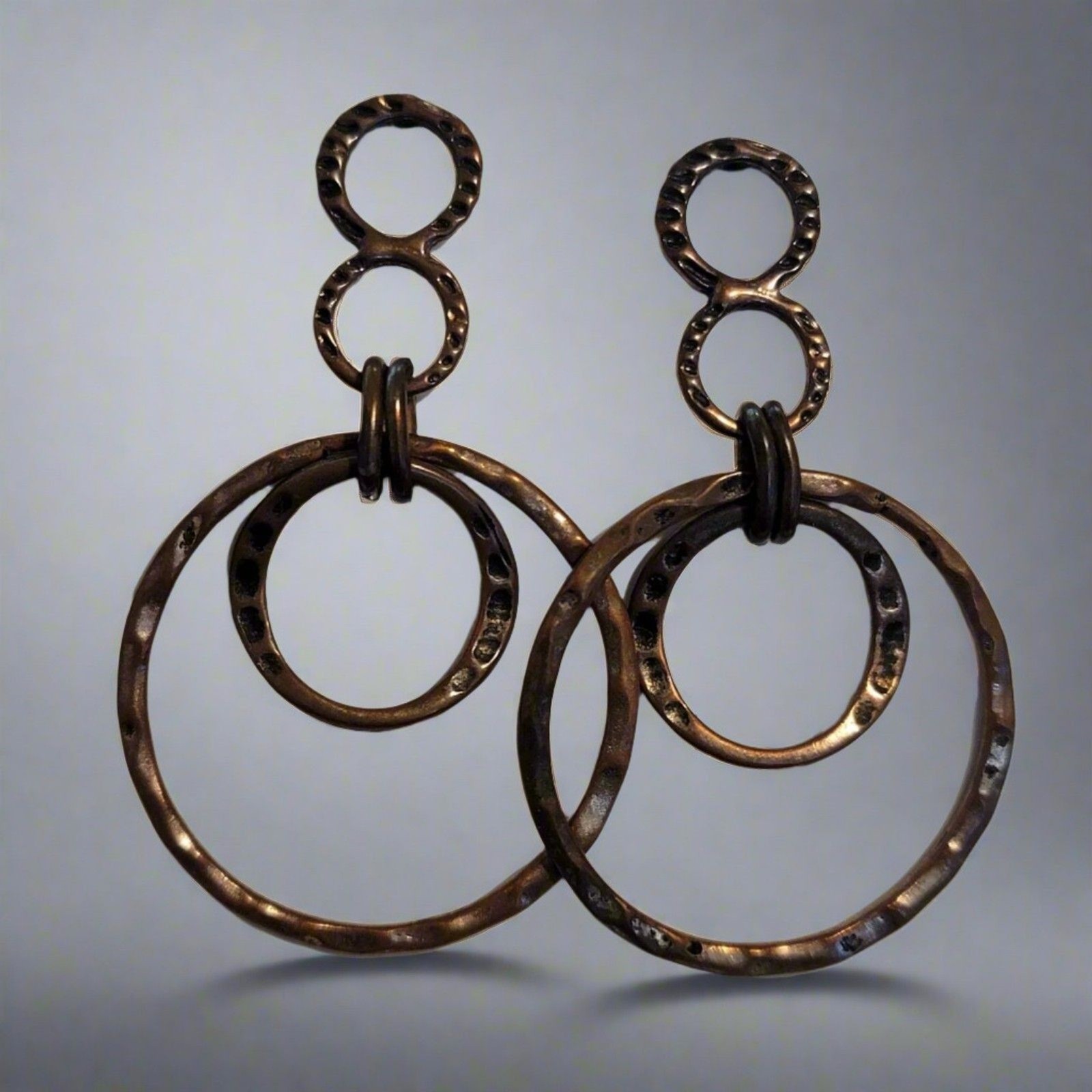 Vintage Copper Tone Hoop Earrings, Hammered Circle Dangle Statement Jewelry