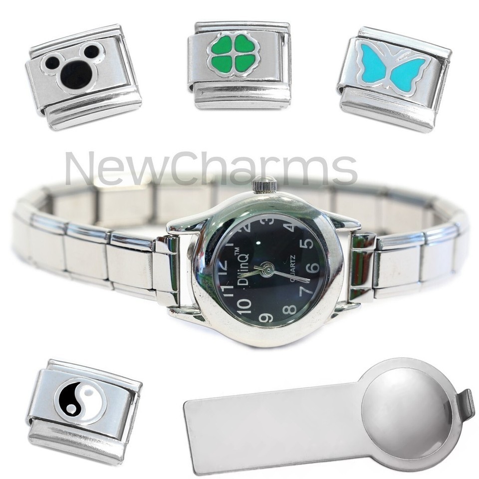 Black Round Italian Charm Watch with Bracelet Plus Tool & Stainless Steel Charms