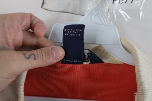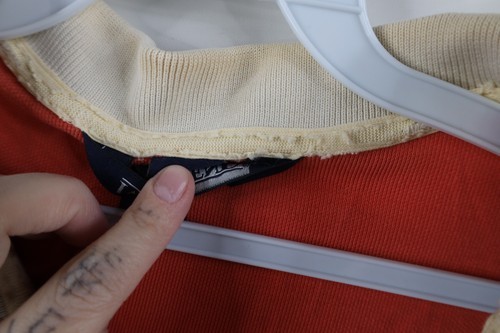 Holes inner collar. Collar, arms discolored. Dark spots, pilling. Color faded. Button holes distressed