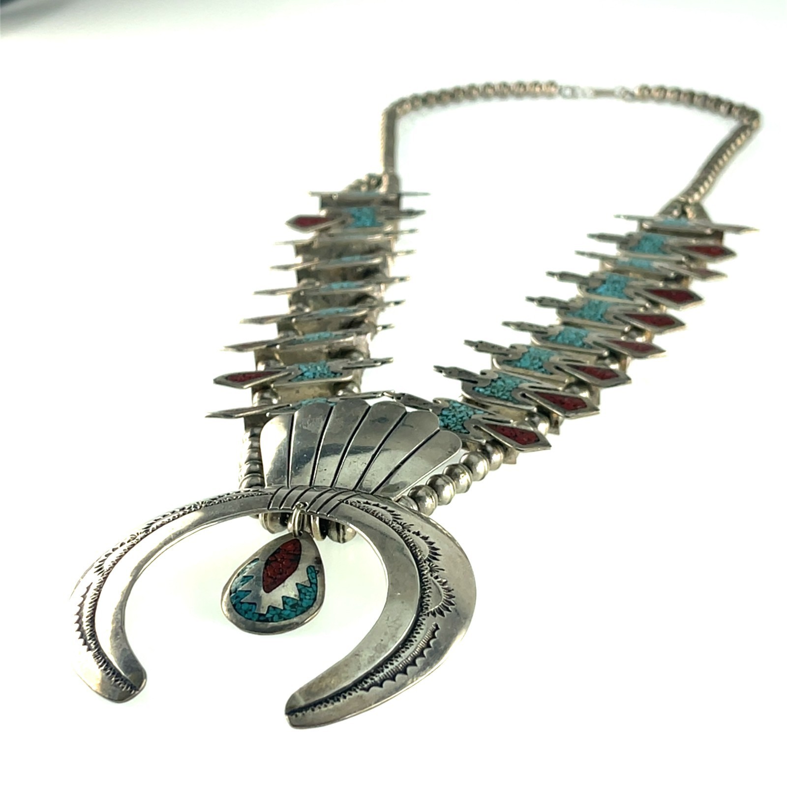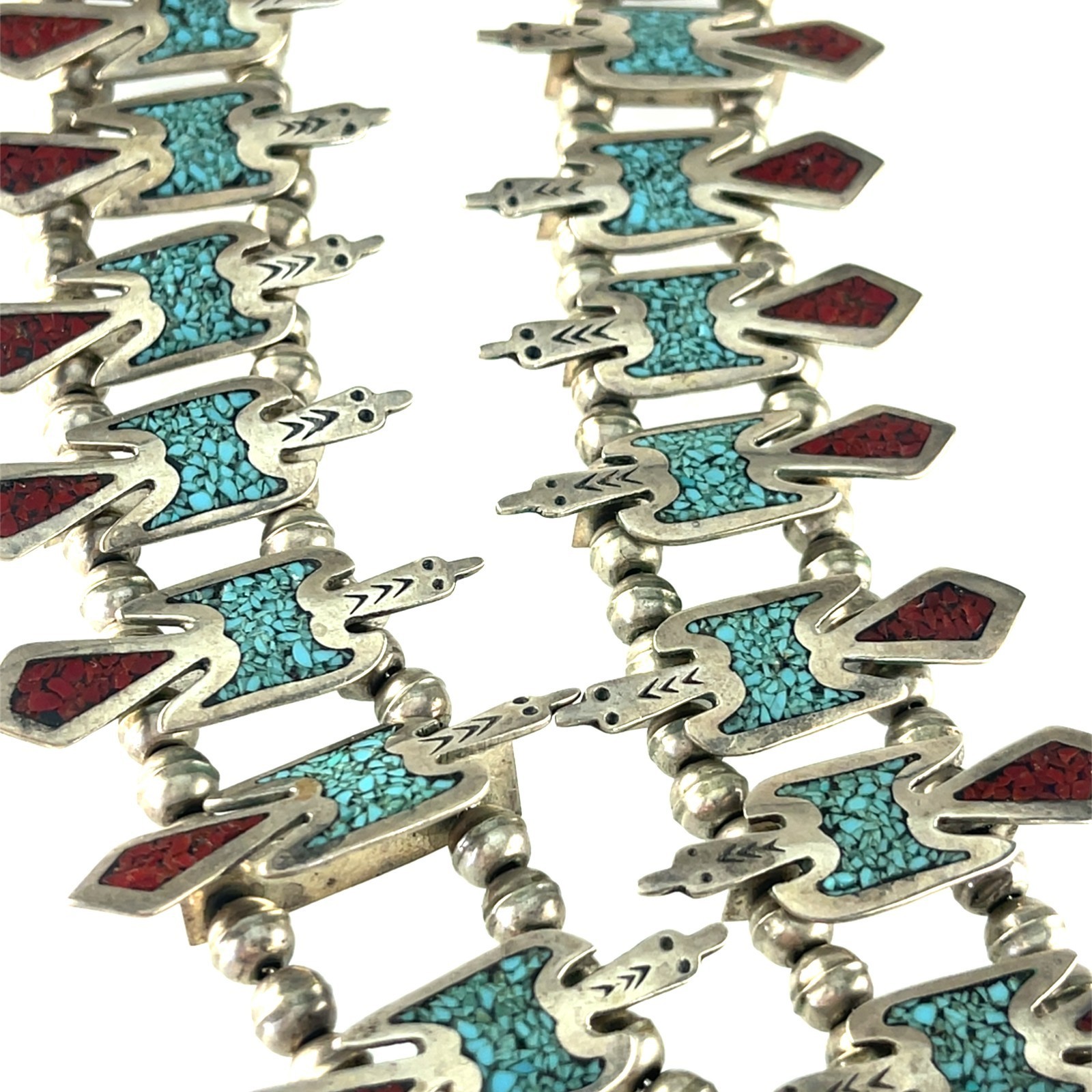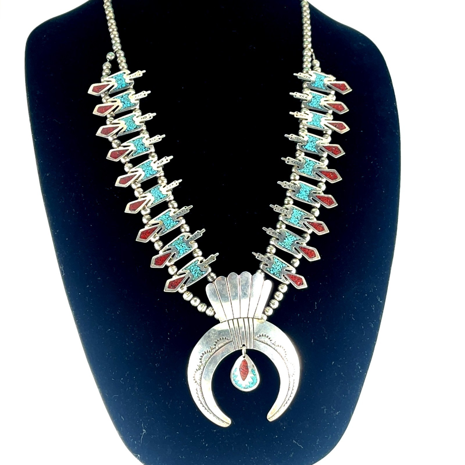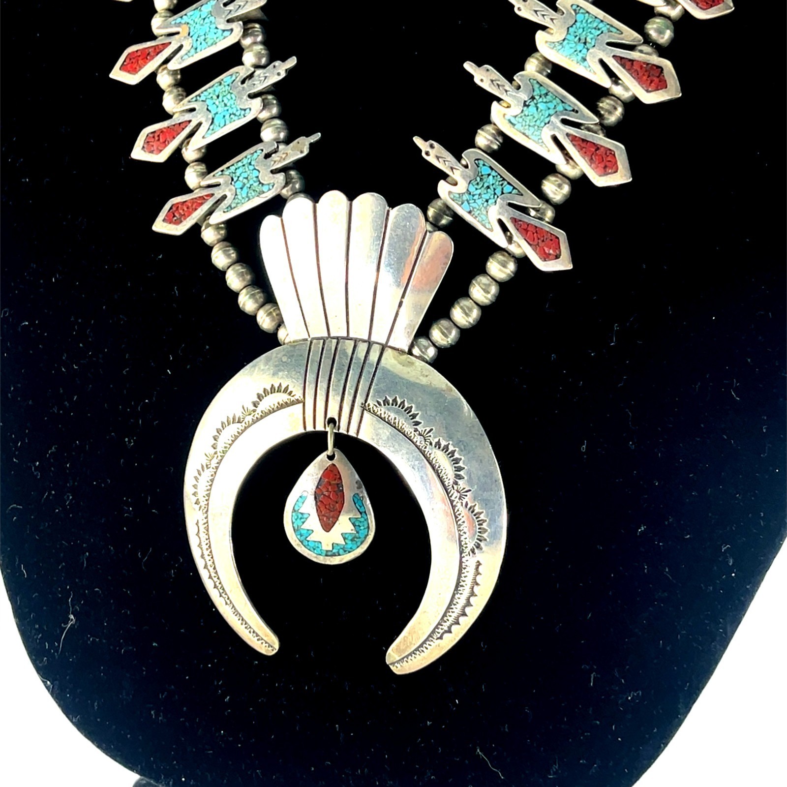 Features Coral and Turquoise Inlay on Eagle "Squash Blossoms" and dangling element on naja