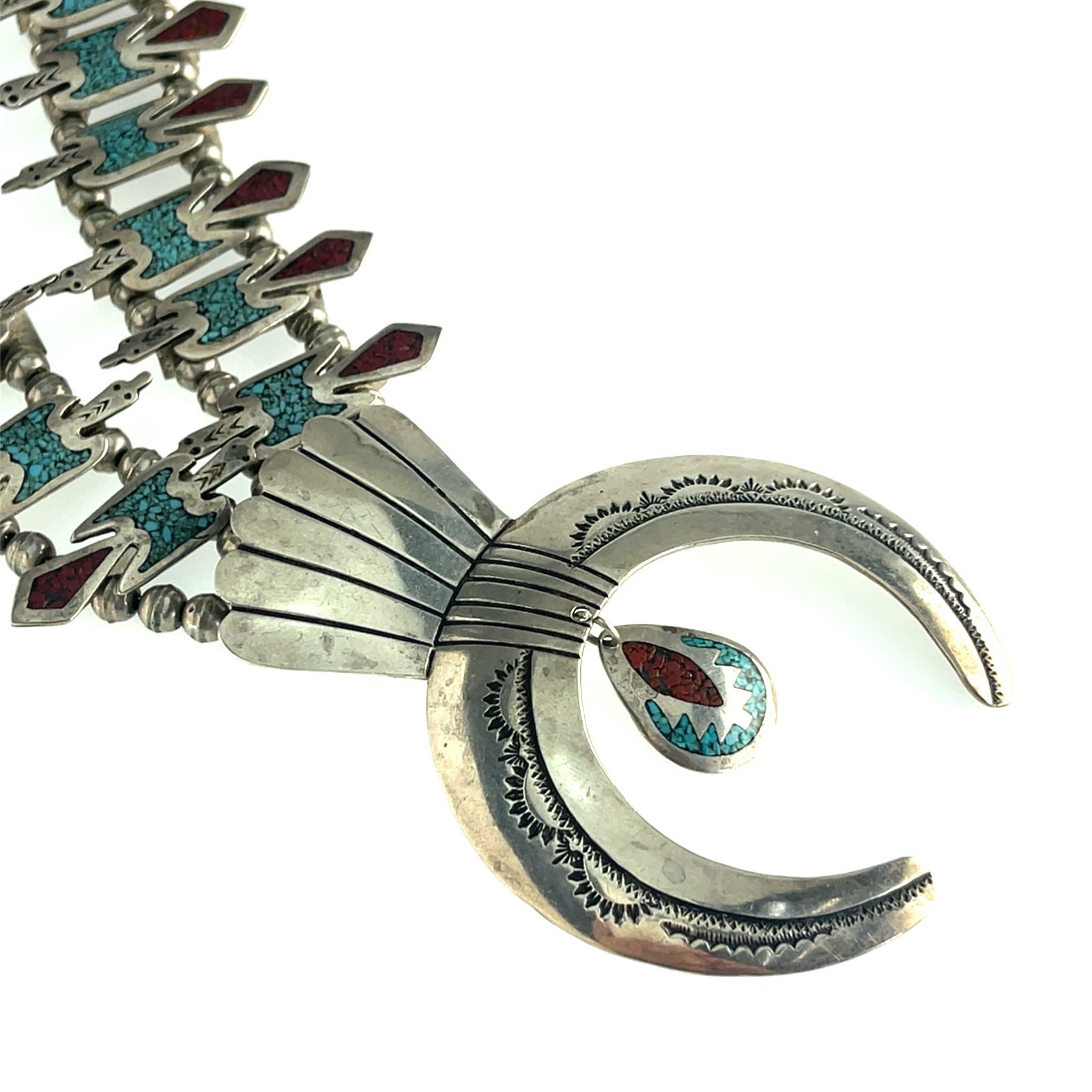 Thomas Singer Sterling Silver Turquoise and Coral Inlay Squash Blossom Necklace