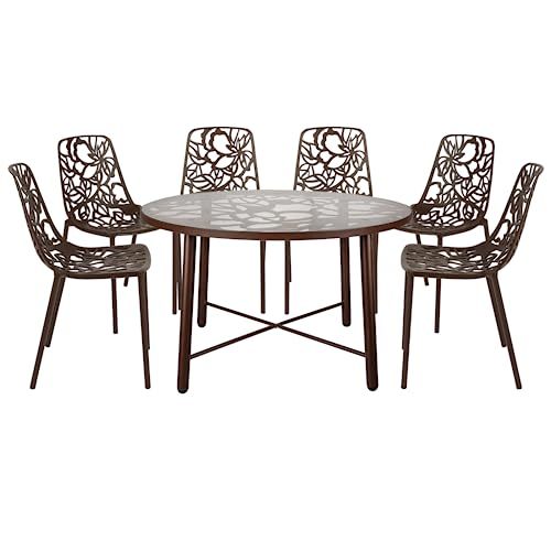 Introducing the stunning and captivating Devon Outdoor Patio Dining Set, a must-have for modern furniture enthusiasts. With its attractive flower design, this set is a true asset that will enhance the beauty of any home. This Dining Set excels when it comes to quality. The aluminum frame not only provides exceptional strength but also ensures the table and chair remain lightweight and easy to move around. This makes it convenient for rearranging furniture or accommodating additional guests. The Powder coated finish not only enhances the chair's visual appeal but also protects it from scratches and wear, guaranteeing its longevity. The table and chairs also come with plastic cap floor protectors, ensuring that your floors remain unscathed even when the chair is moved or rearranged. Meanwhile, the high-quality tempered glass top is a standout feature of the dining table. It not only adds a sleek and elegant look to the table but also provides a sturdy and reliable surface for dining. This dining set is UV-protected, making it resistant to the harmful effects of direct sun exposure. This feature ensures that the item's color and finish remain vibrant and intact, even when placed in areas with prolonged sun exposure. The Devon Outdoor Dining Set is more than just a furniture piece. They are expressions of style, elegance, and quality. The attractive flower design, durable construction, and versatility make them ideal choices for both indoor and outdoor settings. Elevate your decor and create a captivating dining area with this set. Create lasting memories with your loved ones as you gather around this exquisite dining set.