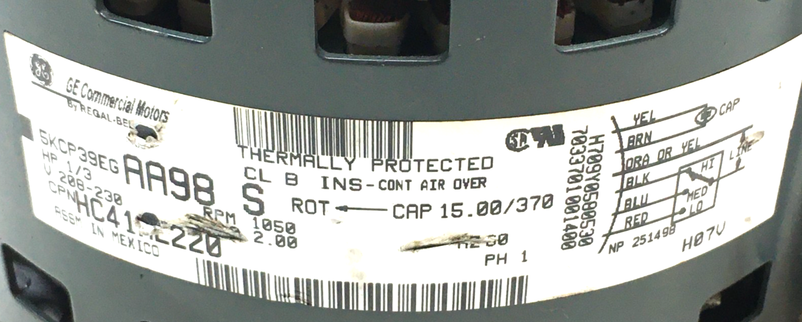 This is GE Blower Motor 5KCP39EGAA98S HP1/3 RPM1050 208-230 V Hz 60 HC41AE220 used part, comes with a brand new capacitor.