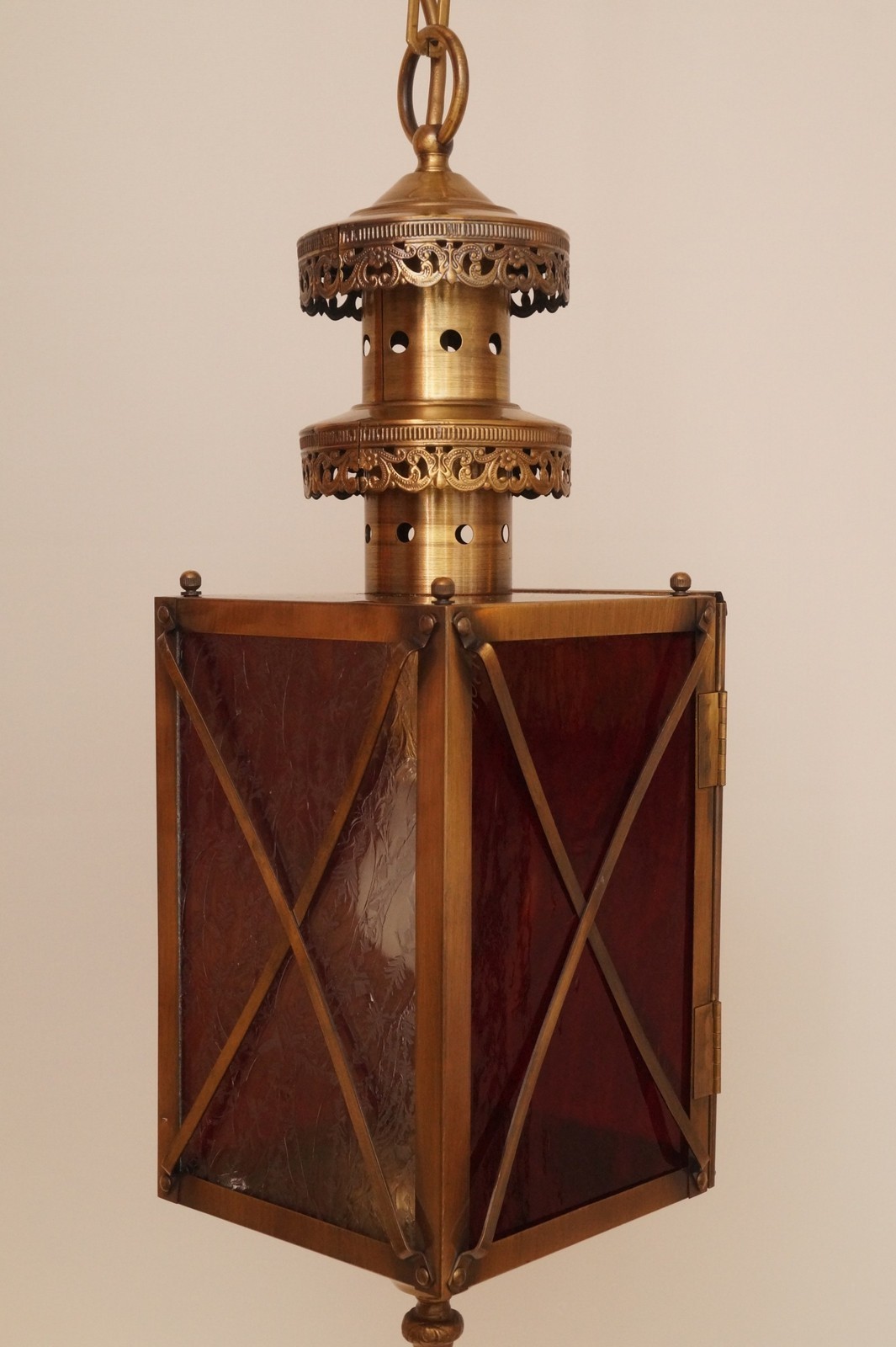 Elegant brass gear with beautiful antique patina. Two fields with red lead glass, 2 fields with real ice flower glass. About 1980s. Door to change the lamp. Total height with chain approx. 96 cm, height lamp approx. 50 cm. Complete renewed electrical installation. 60 watts.