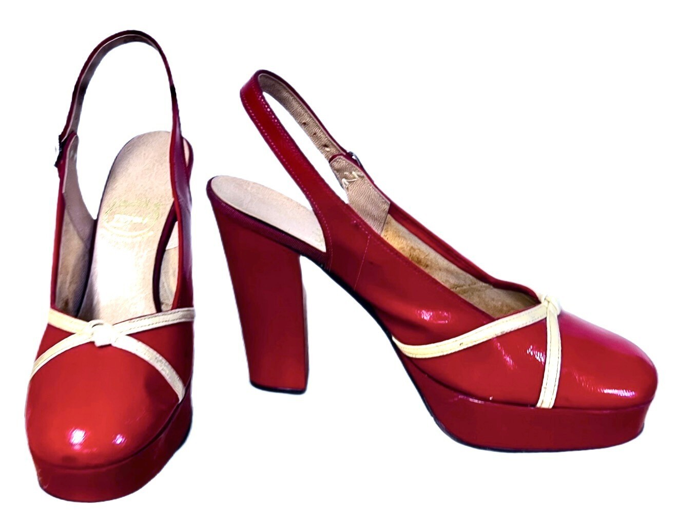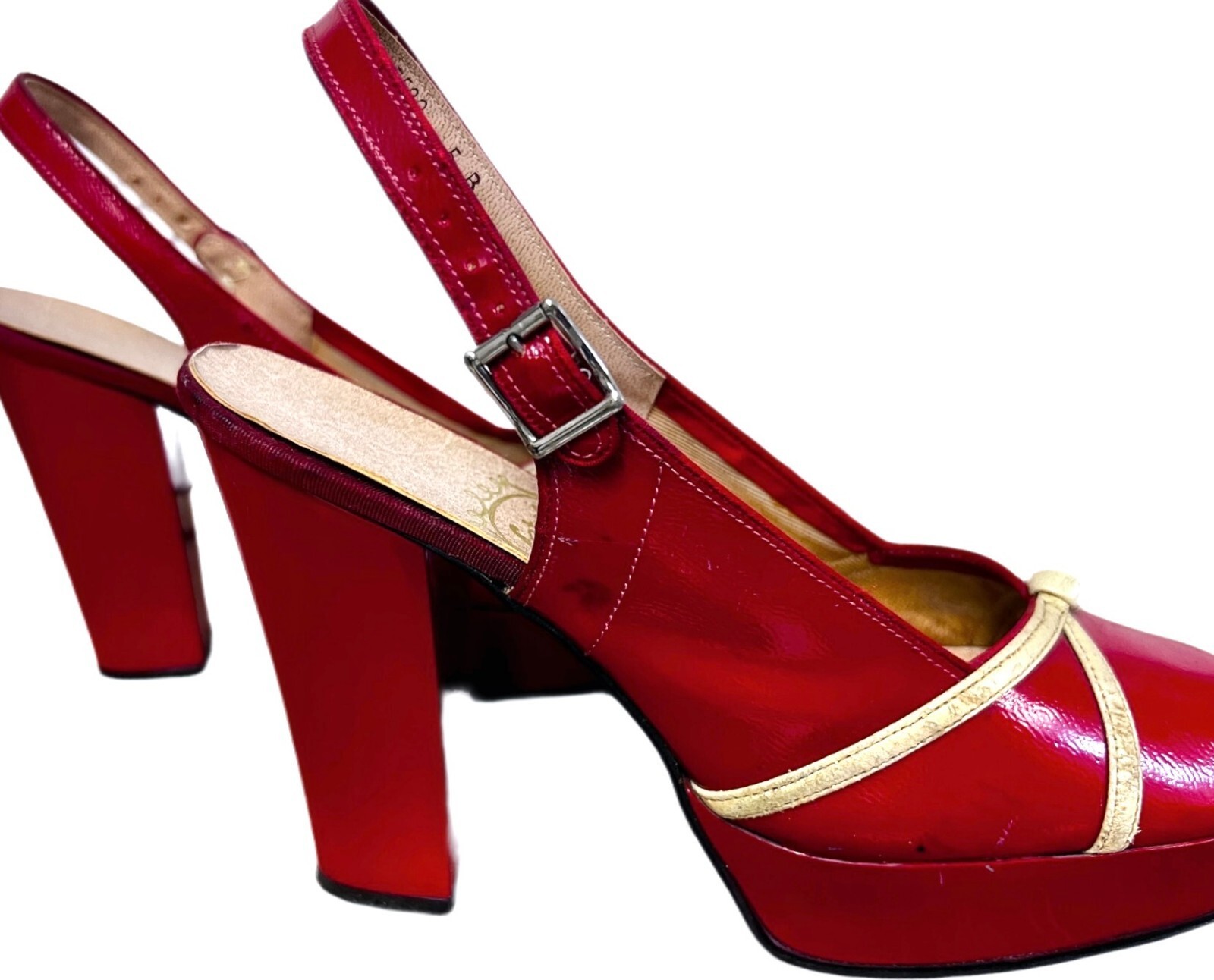 Vintage 70's Chunky Platform Shoes Womens 5 Red/White Slingback Hippie Lotus UK