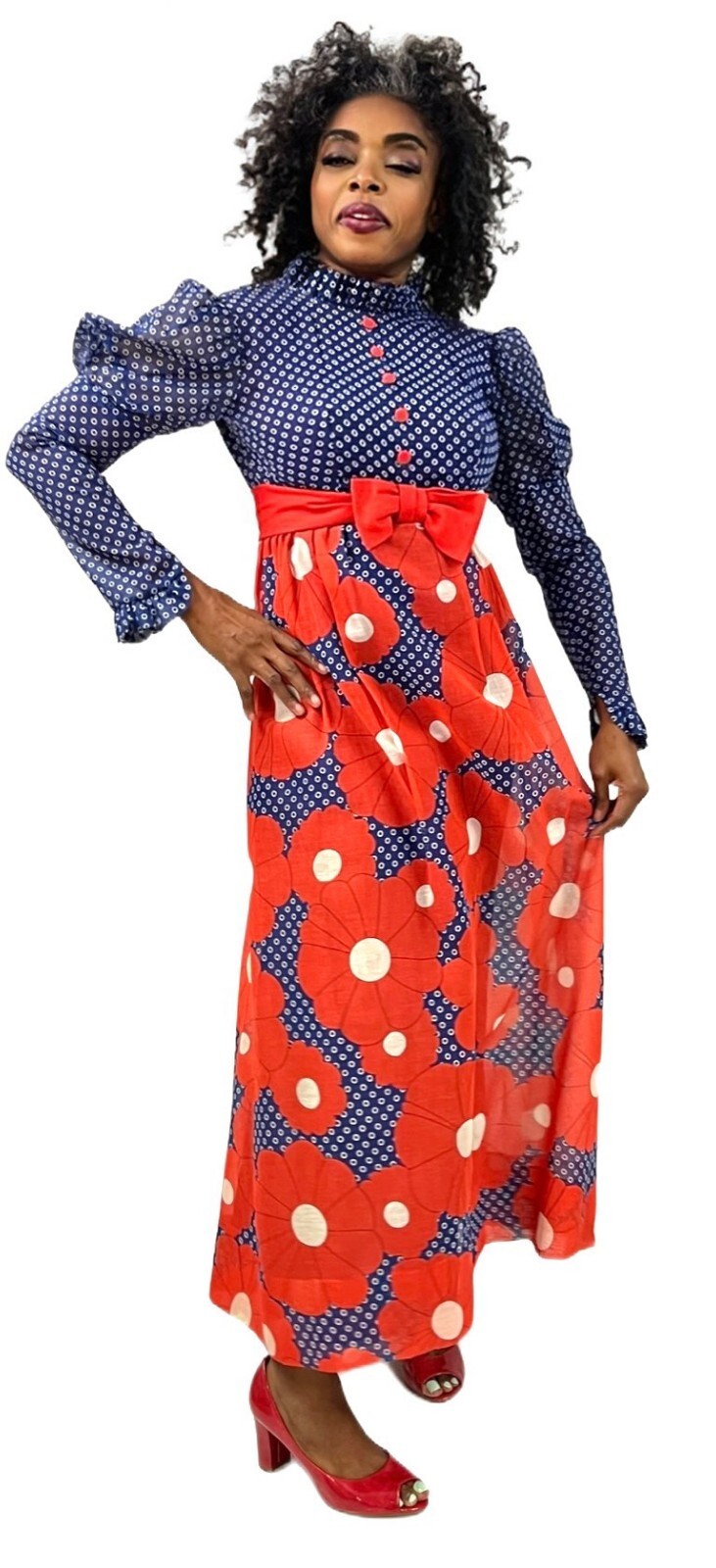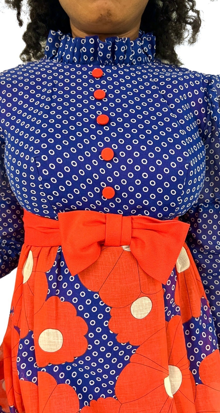 Vintage late 1960s?early 1970s Mod maxi dress in bold red and blue oversized floral print cotton gauze. Features leg o? mutton sleeves with 24? length, empire waistline, and a Victorian Revival-inspired silhouette with floor-length skirt. Fully lined in acetate with a pinked (not hemmed) finish ? a classic detail of the era.