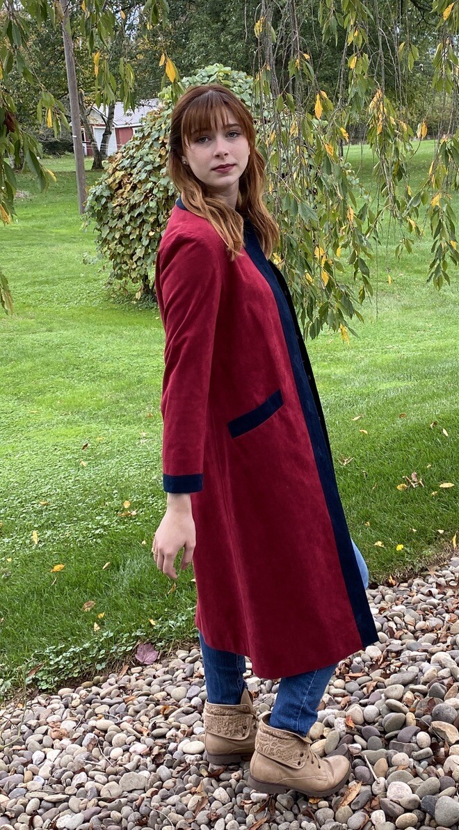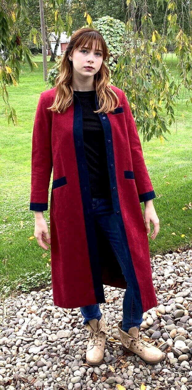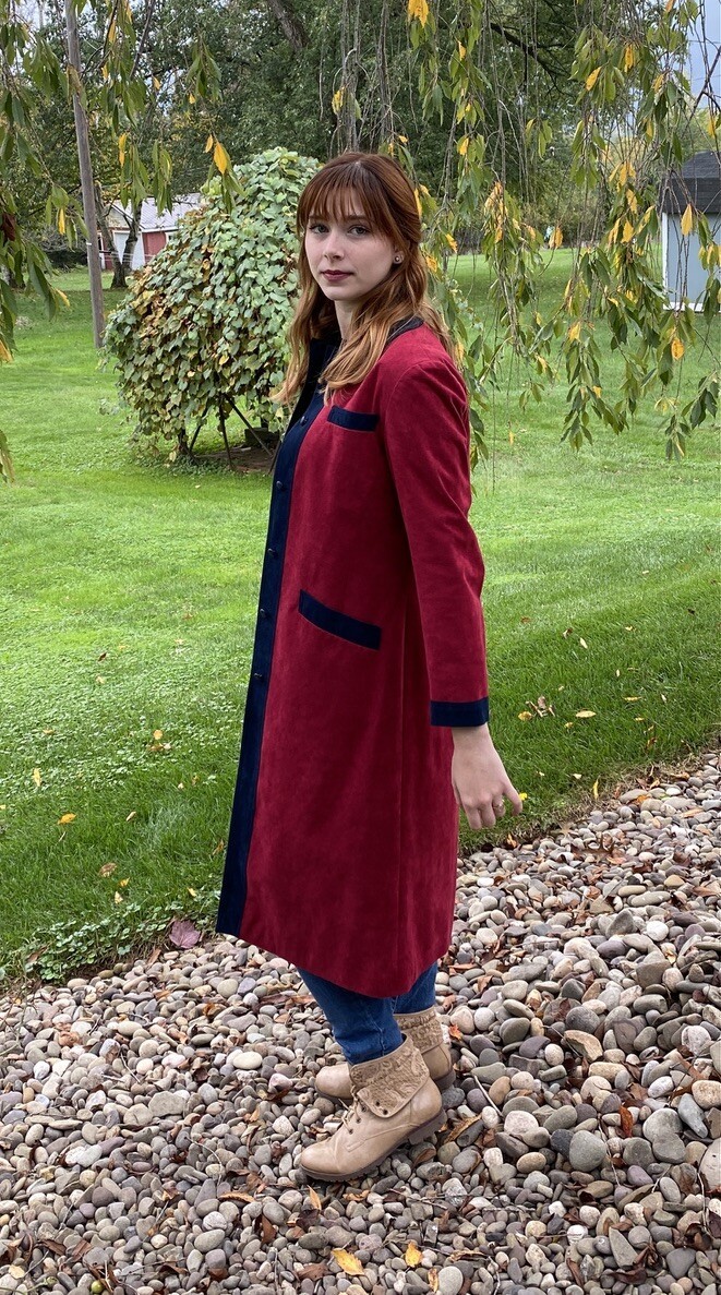 Vintage 1970s Nat Kaplan coat dress in ultra suede color block design of vivid blue and red. Lightweight yet structured, this piece doubles as a coat or a dress. Features front pockets, red nylon lining, and no belt (originally designed without one). Easy care ? machine washable ultra suede.