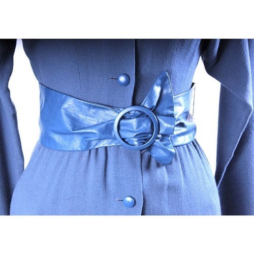 Collectible vintage Emanuel London Collection dress, Made in England. Likely from Elizabeth and David Emanuel ? the design duo behind Princess Diana?s iconic 1981 wedding gown. This piece channels Diana?s early-80s style: blue wool voile with a pointed leather collar, matching leather belt, and leather-covered buttons. Features batwing sleeves, nipped 26? waist, and slightly full skirt.