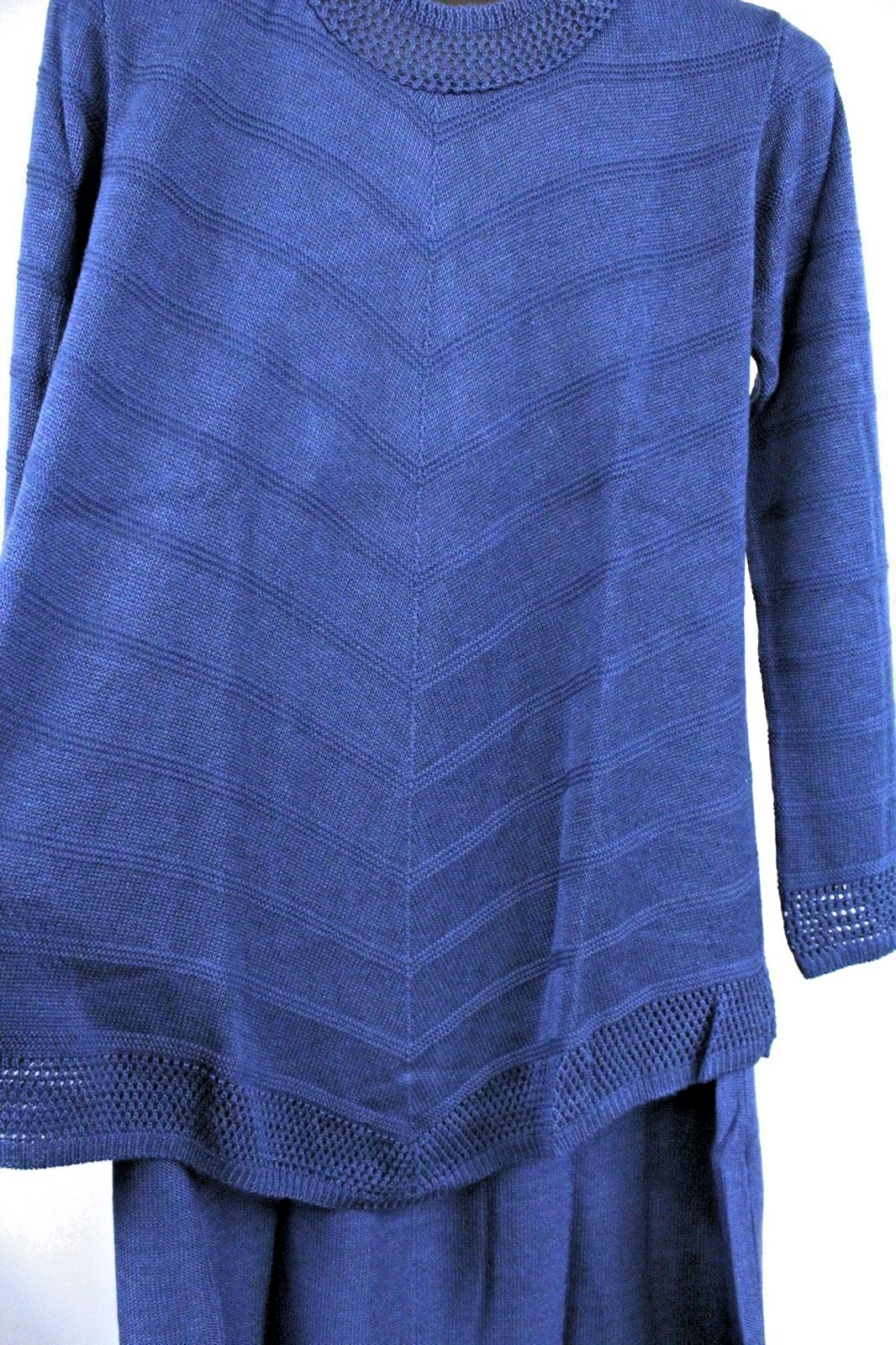 Unworn vintage Rosanna sweater suit in a soft cornflower blue knit, reminiscent of St. John Santana knit quality. The top features long sleeves with openwork chevron knit panel in front, no shoulder pads for a naturally draped silhouette. The A-line pull-on skirt has a folded 1" elastic waistband and is fully lined for smooth structure.