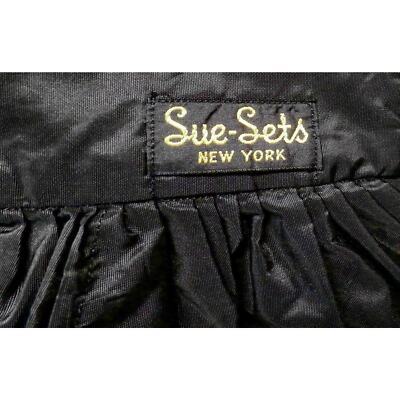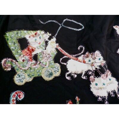 Exceptional Retro vintage 1950s apron in crisp black taffeta from Miss Kitty's own collection. It has an appliqued vintage print featuring anthropomorphic kittens, mice, and all sorts of fairy princess stuff going on. The pocket is behind the carriage. The label is Sue Sets, New York. These usually are quite artistic, and this one is exceptional! One size fits all.