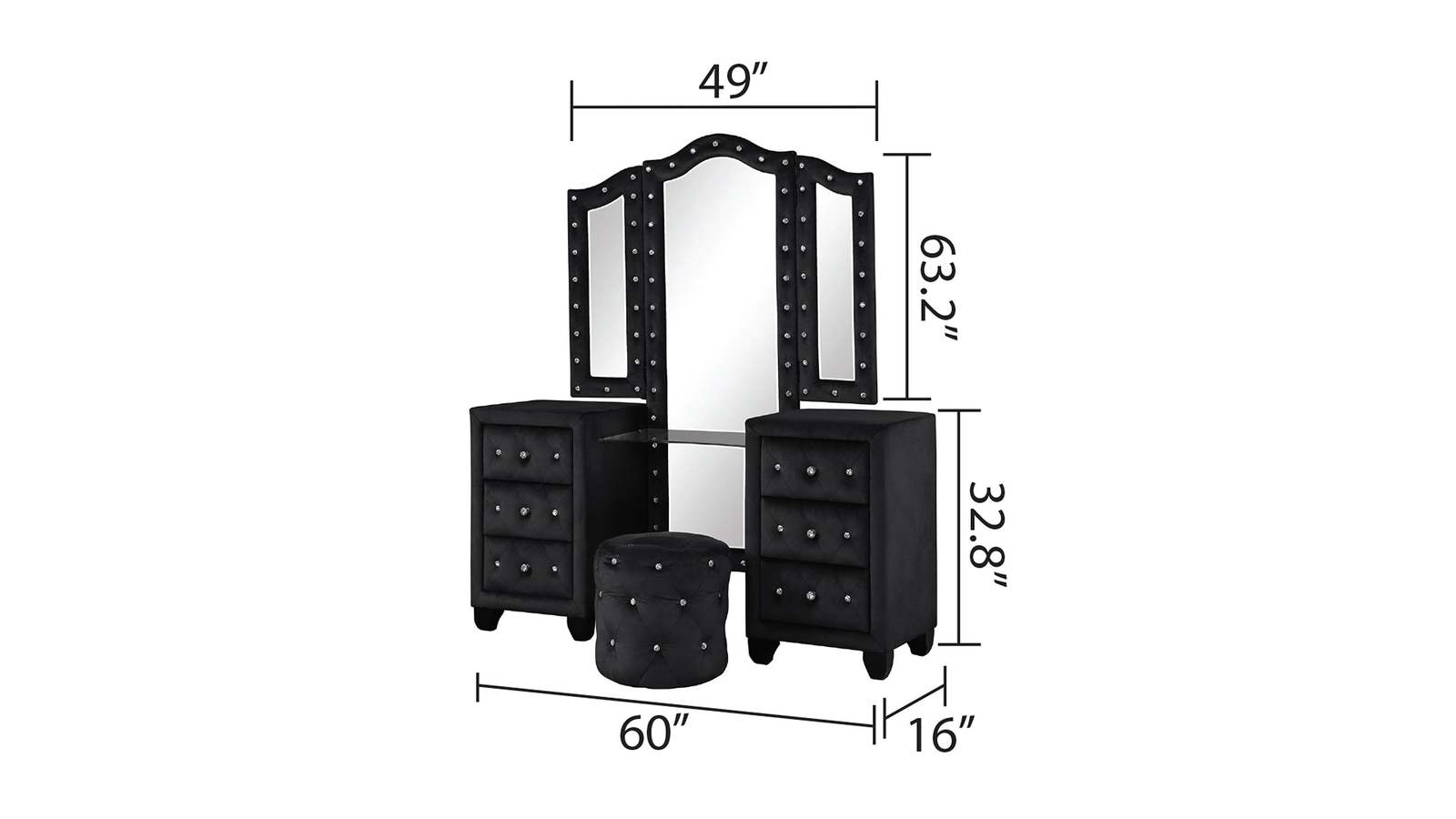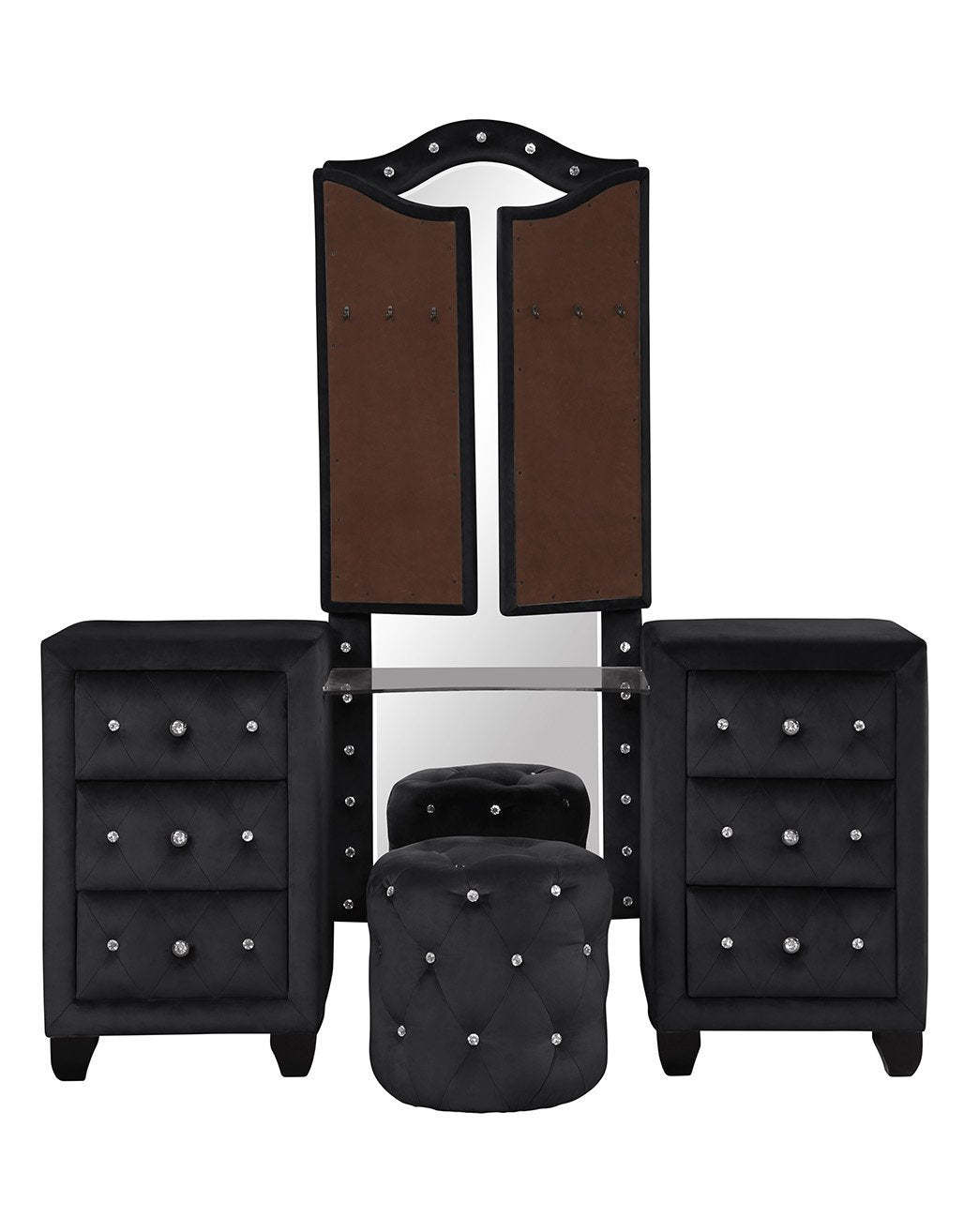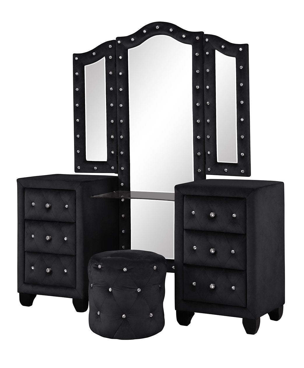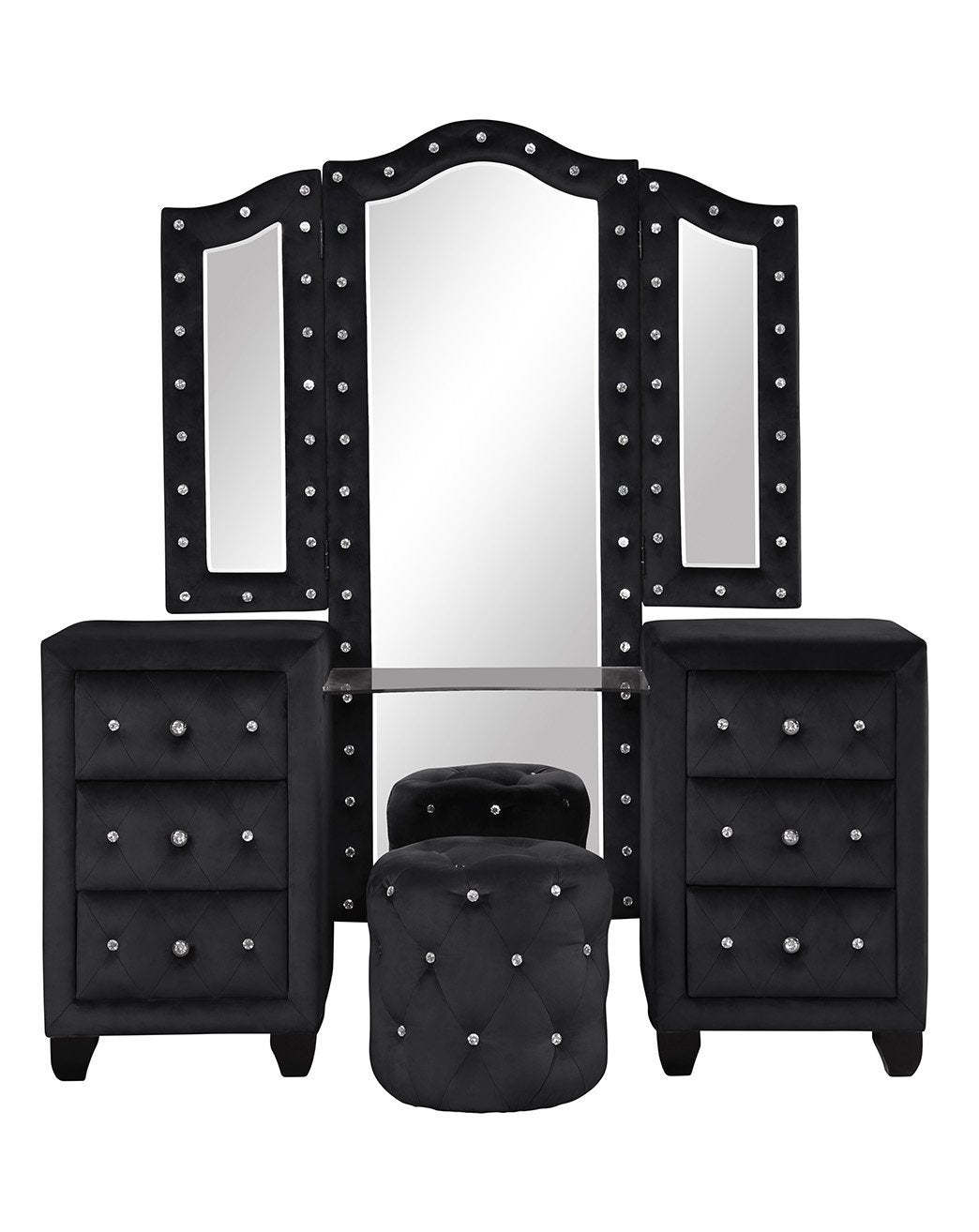 Modern Black Velvet 6-Drawer Vanity Set with Stool - Crystal Tufted