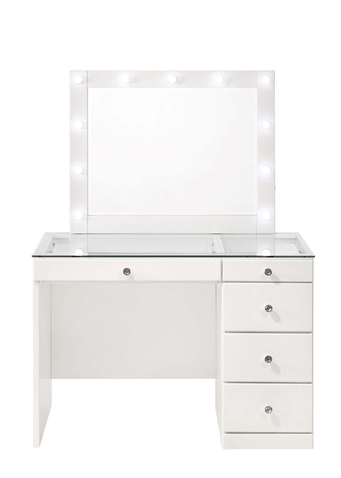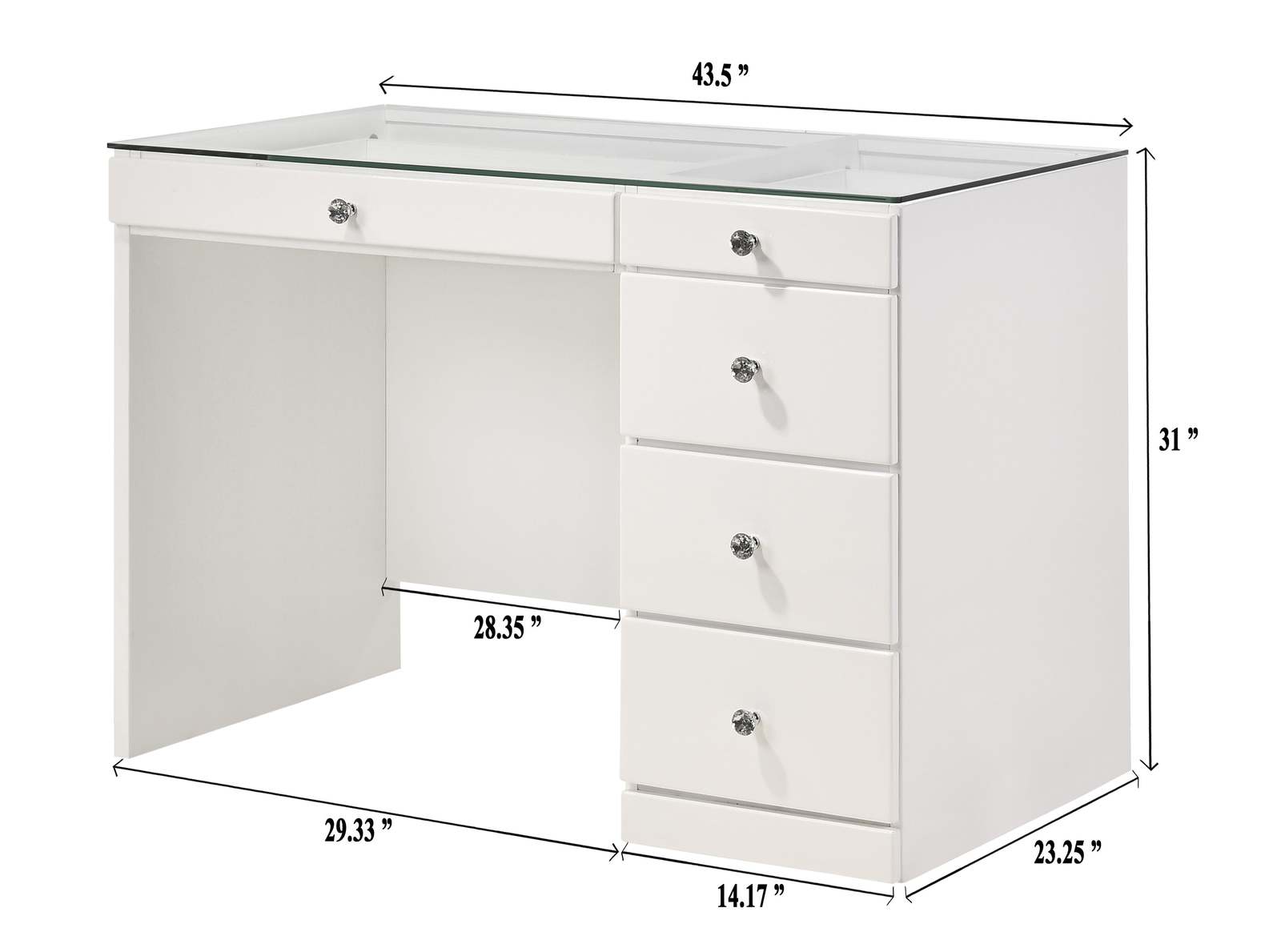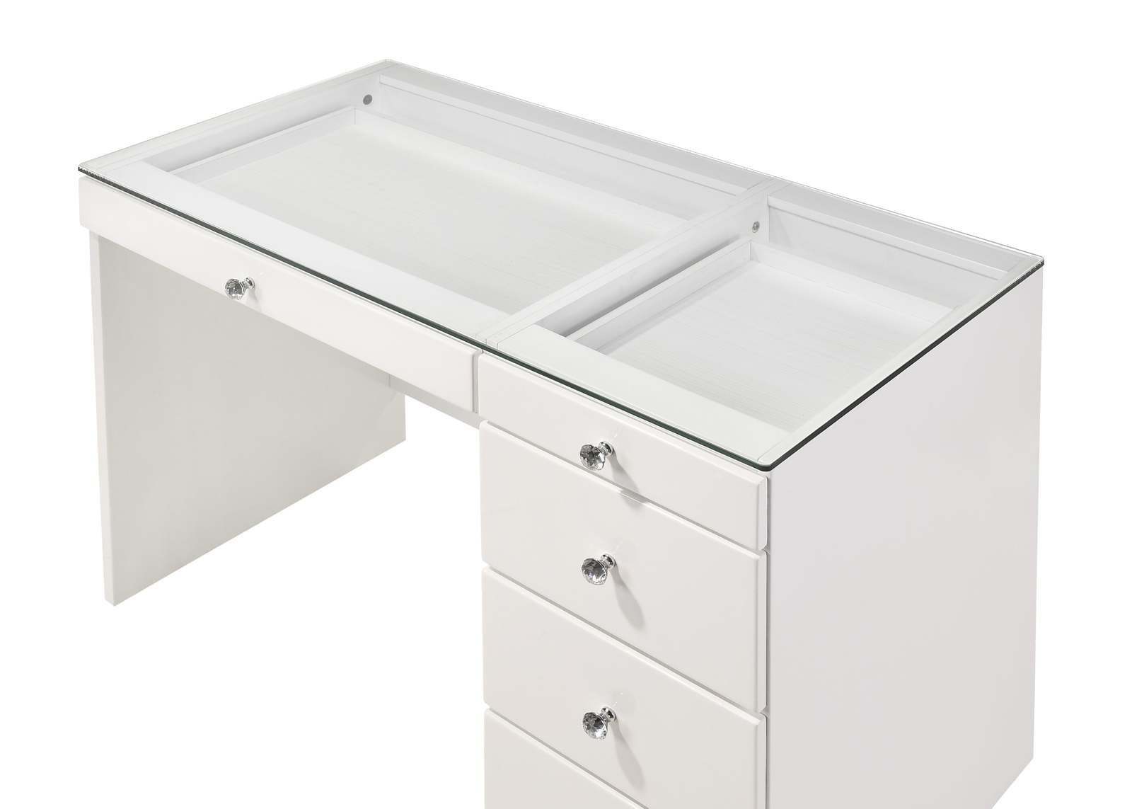 This Vanity features a white finish, a glass top and 5 drawers with knobs. It is a perfect addition to your bedroom suite.