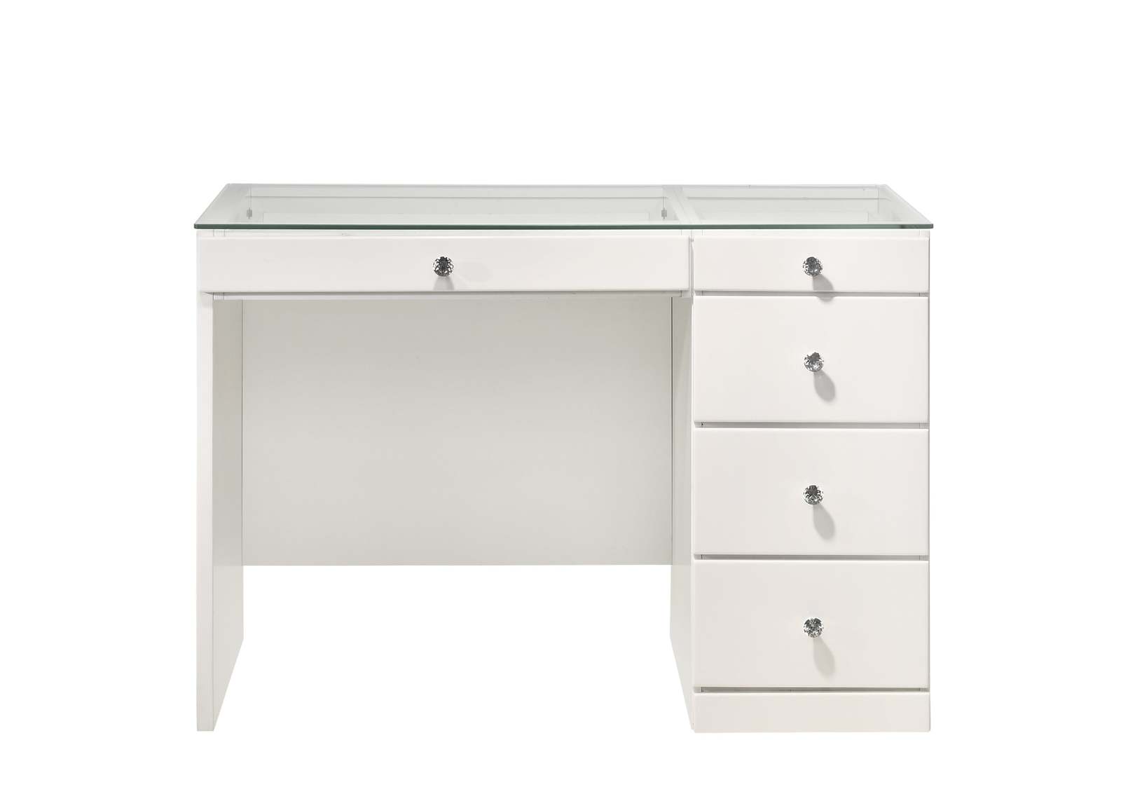 White Glam Makeup Vanity Table, Glass Top, 5 Drawers Crystal Knobs