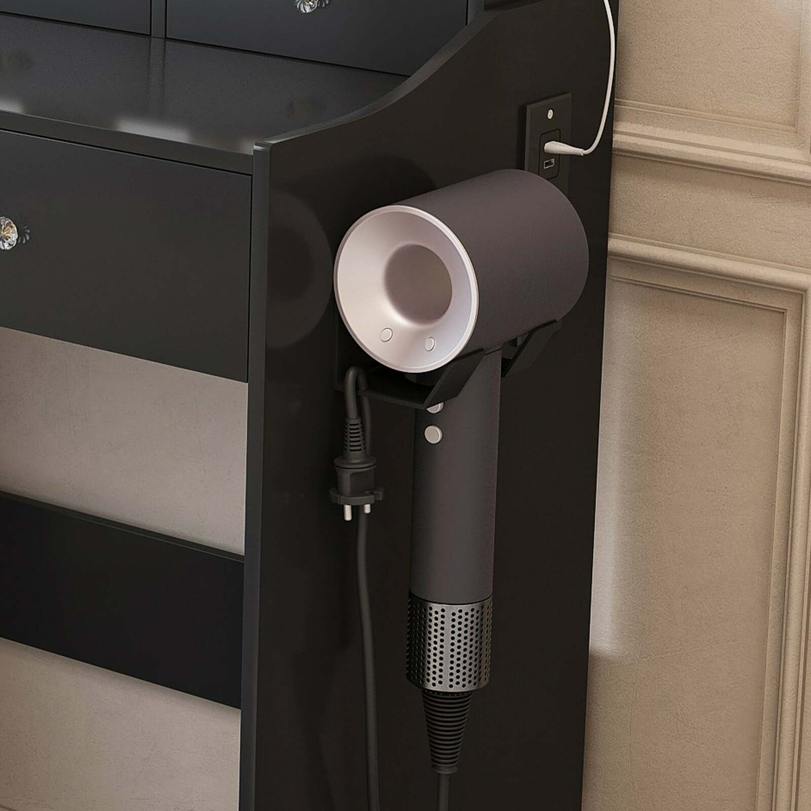 Built-In Power Outlet Hair Dryer Holder ? Includes a convenient plug socket and a dedicated hair dryer holder, allowing easy access to styling tools while keeping cords neatly organized.