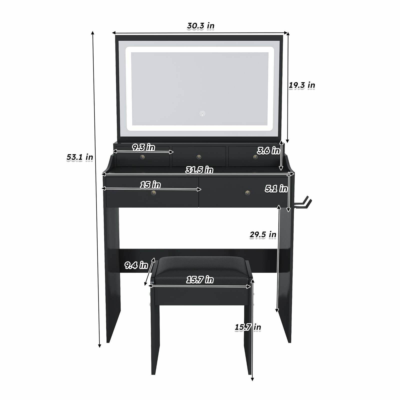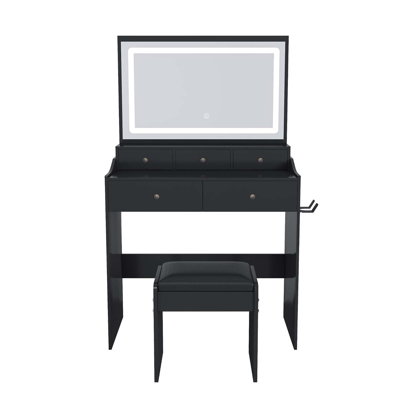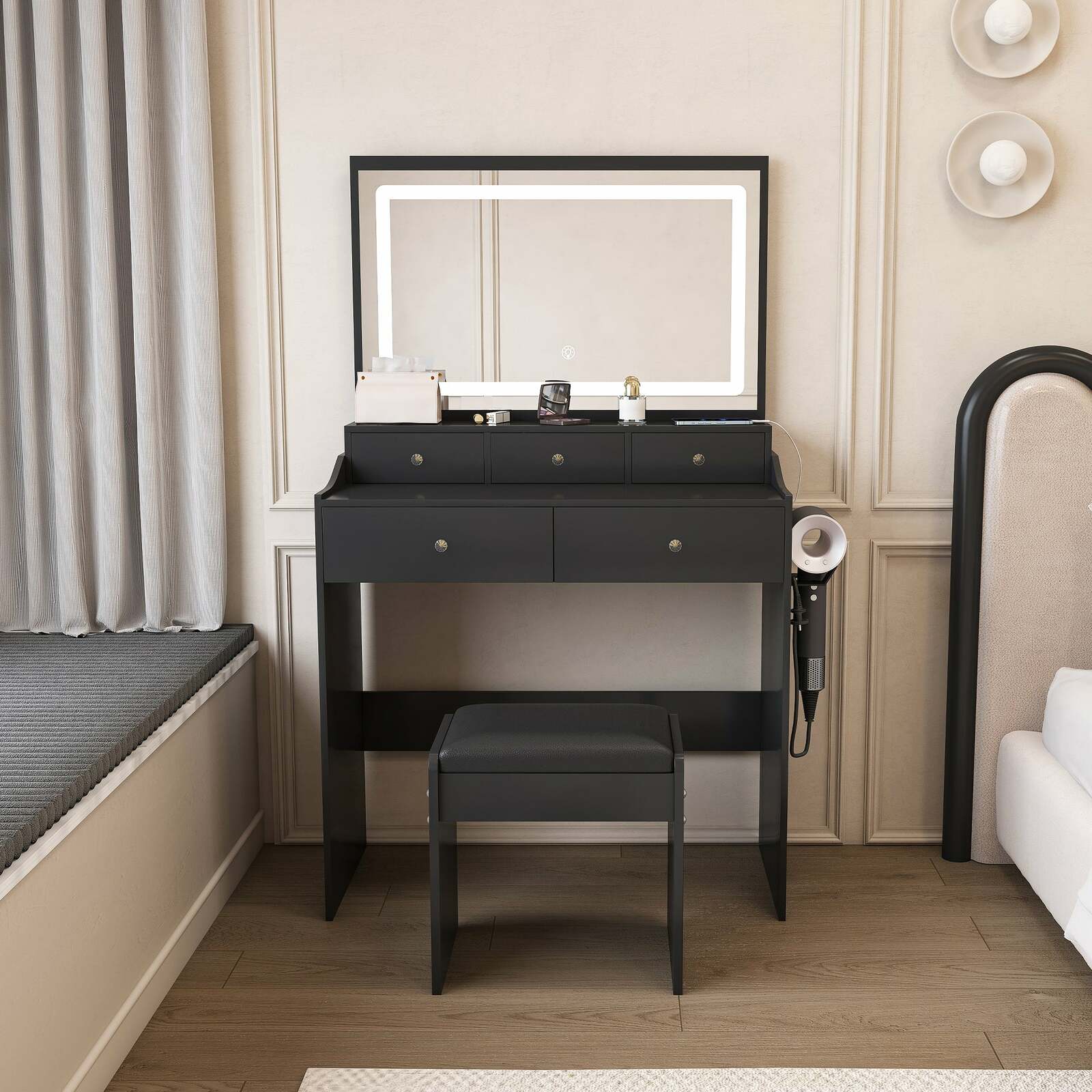 Modern Black Vanity Set: Power Outlet, Hair Dryer, LED Lights
