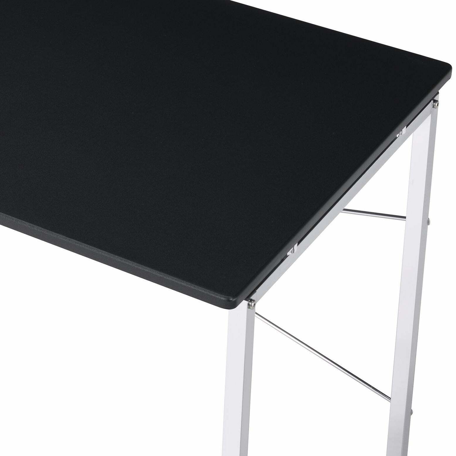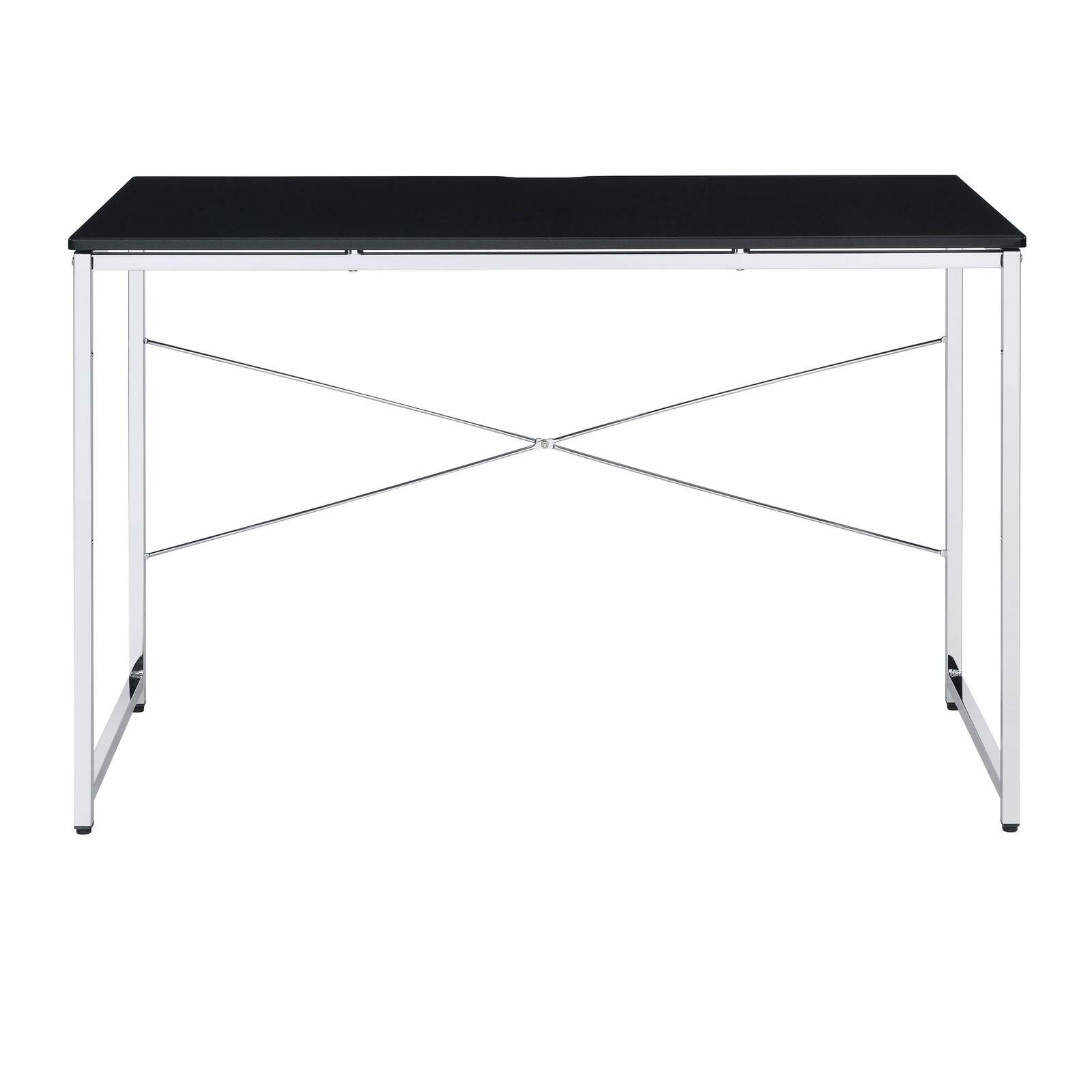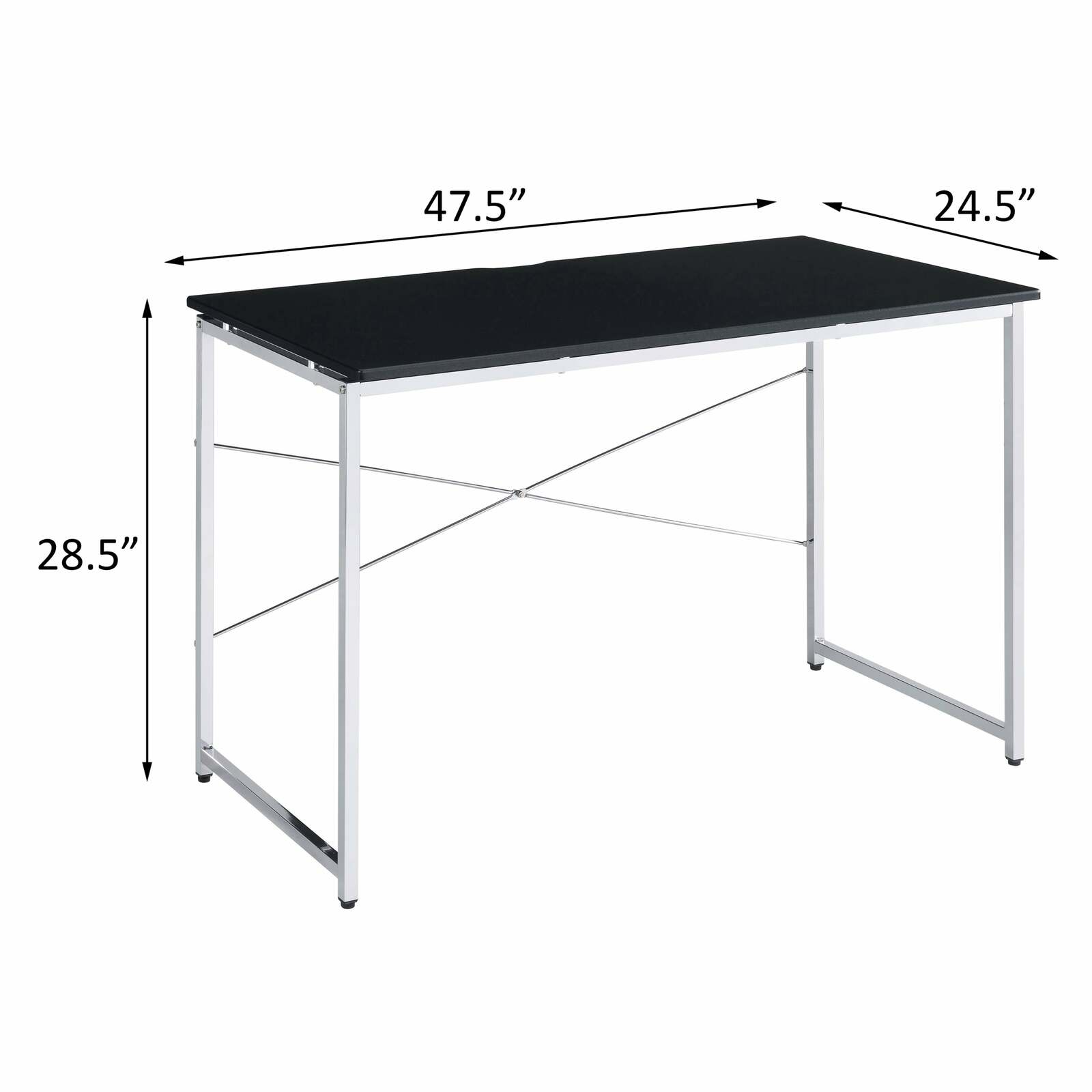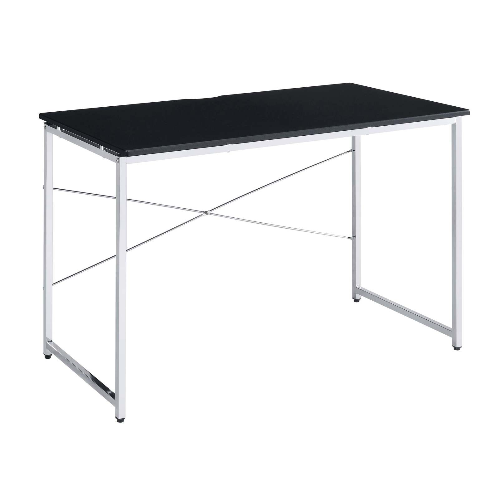 This modern vanity desk boasts a sleek black and chrome finish, making it a contemporary and stylish addition to your bedroom or dressing area, while providing a spacious and dedicated surface for makeup application, hair styling, or beauty routines. Its eye-catching x-shape crossbar adds a unique and modern touch to its aesthetic, with a metal frame finished in chrome ensuring durability, stability, and an elegant touch to the desk.