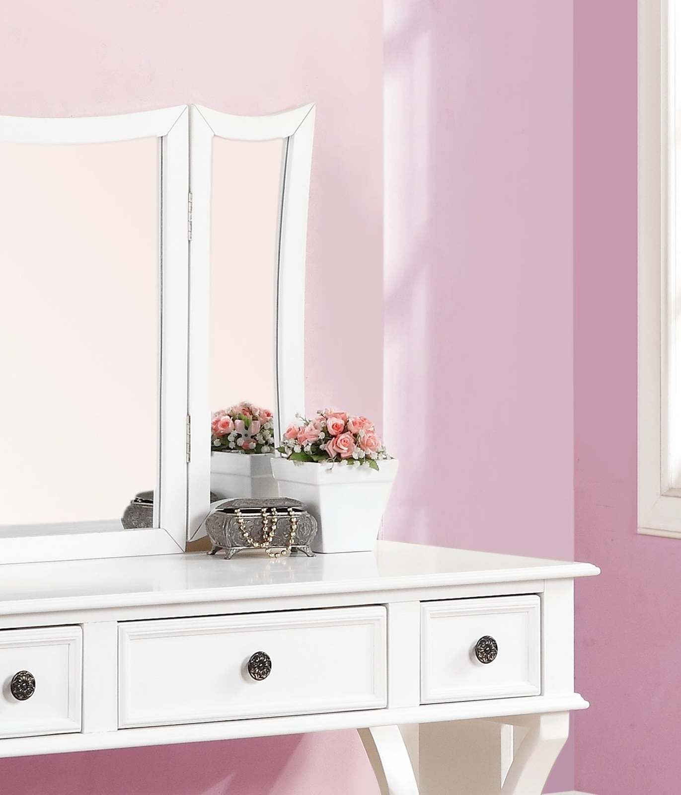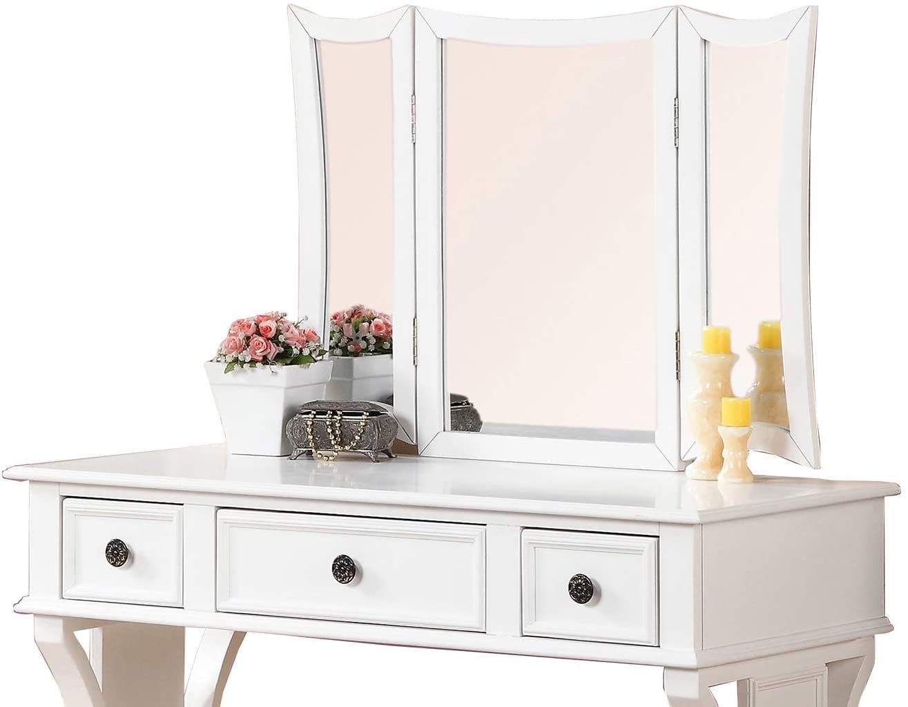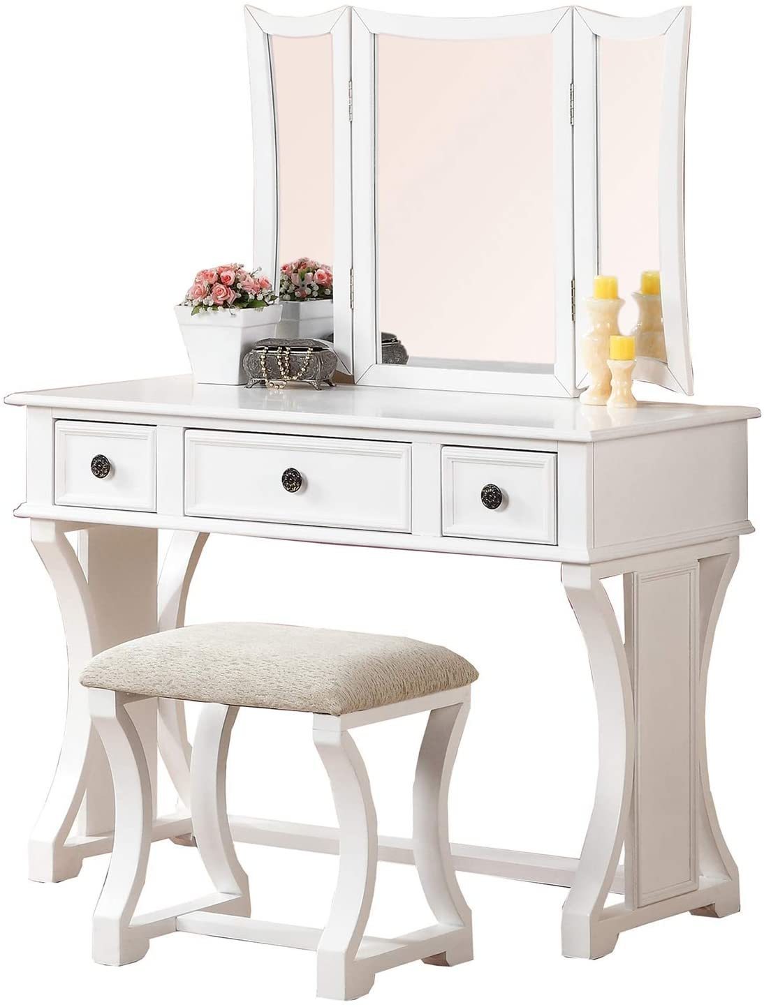 Unique Modern White Bedroom Vanity Set | Stool, Foldable Mirror, Drawers
