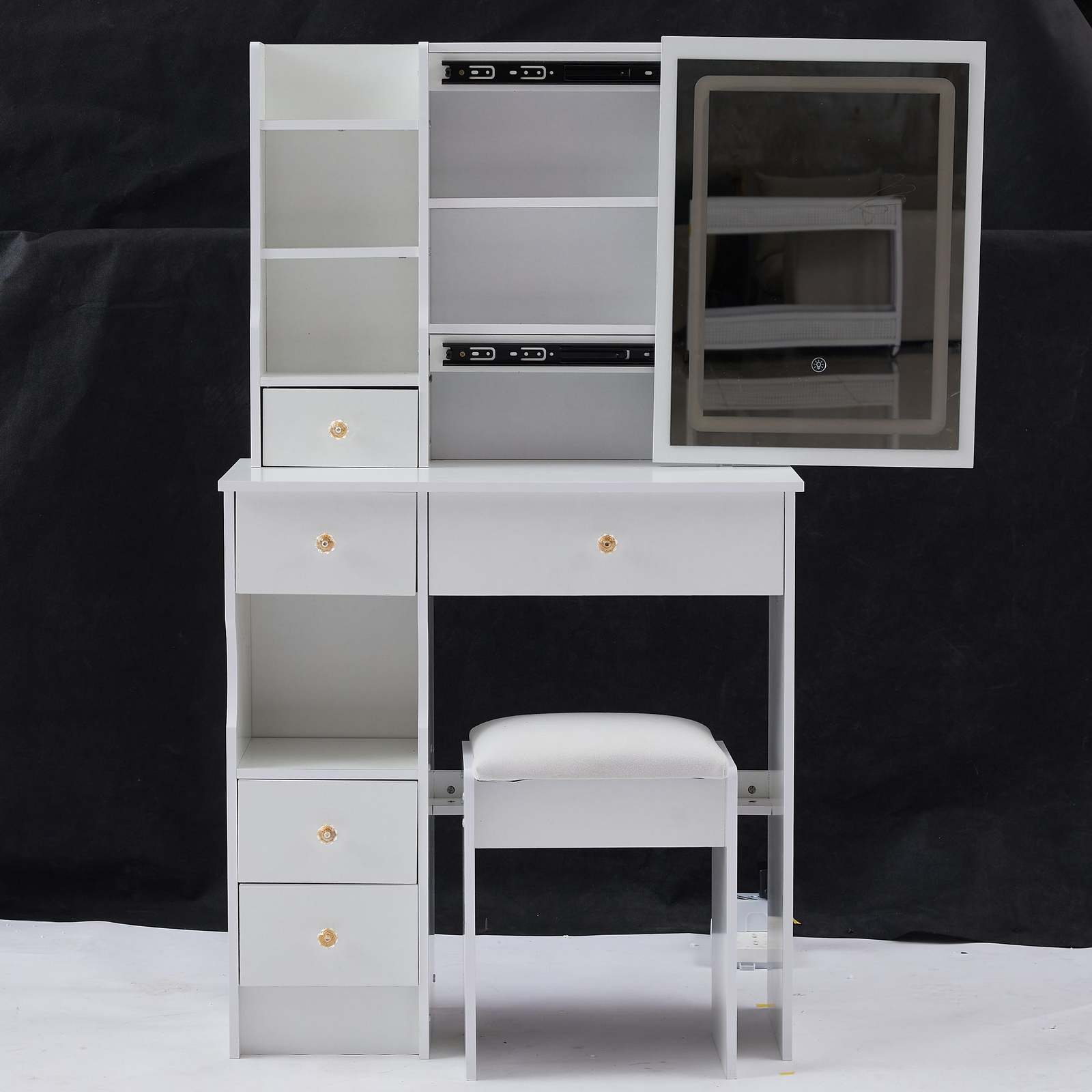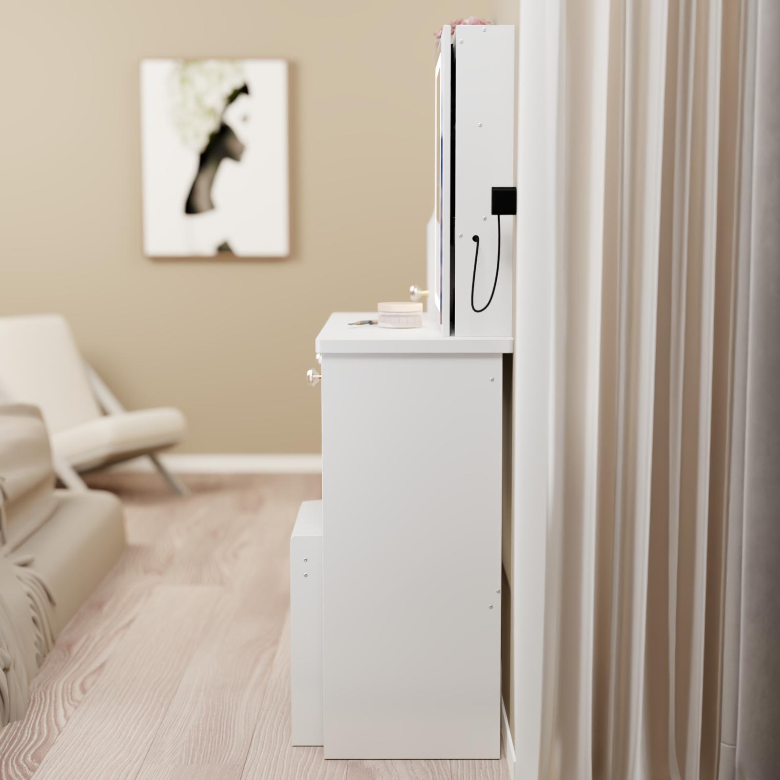 [Configuration]: This dressing table is a basic version, including a mirror light, not include built-in socket or hair dryer stand. Due to the same installation steps for the same product with simple, basic, and luxurious configurations, the installation manual is in a universal form.