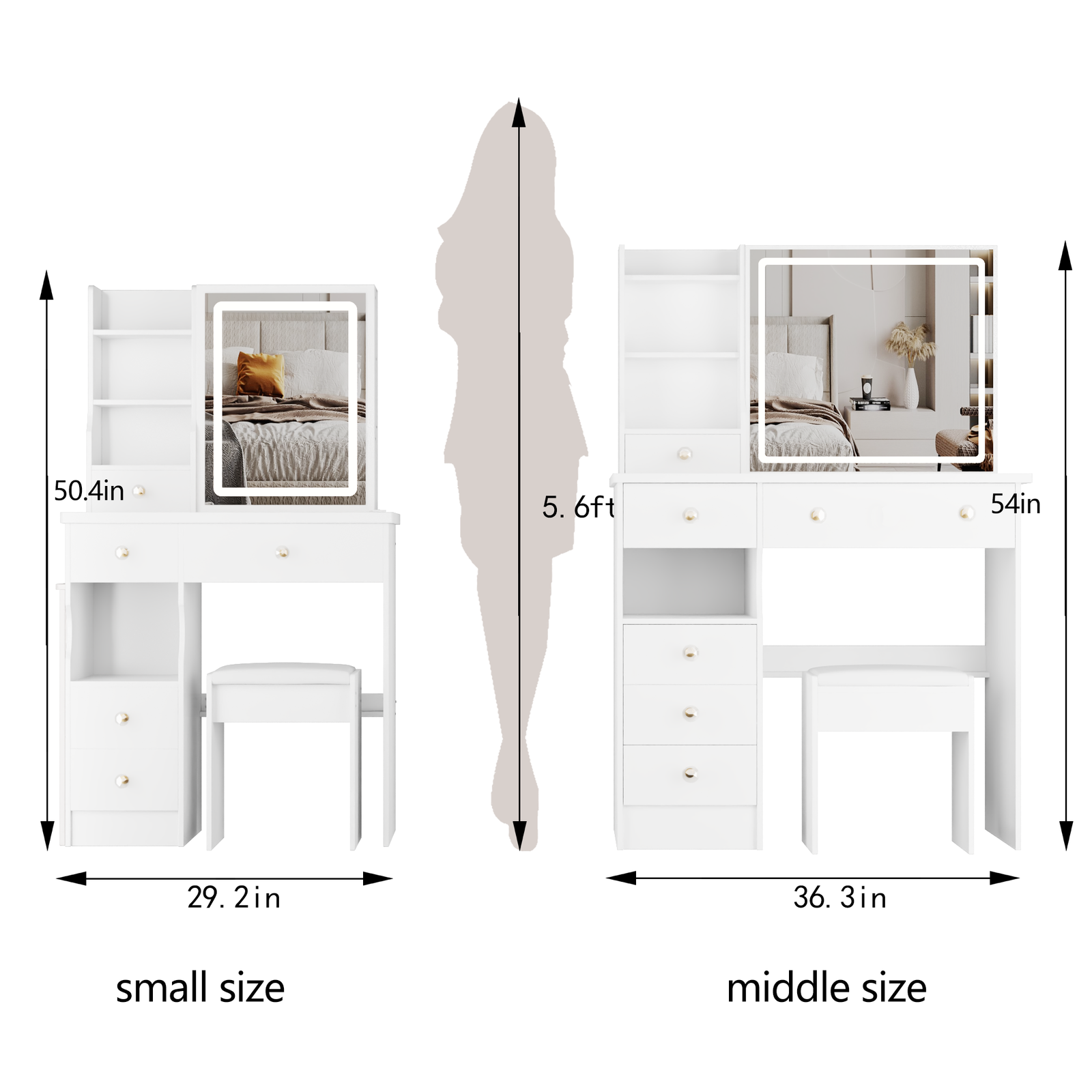 [Specially designed for small spaces]: This dressing table is 29.2' long and 50.4' high, designed specifically for small bedrooms. Its advantage is small size, less space occupation, which is suitable for little girls to use. Its disadvantage is that due to its small size, it is not suitable for adult ladies over 5.5 feet tall. Therefore, please note before purchasing that this is a small-sized dressing table set.