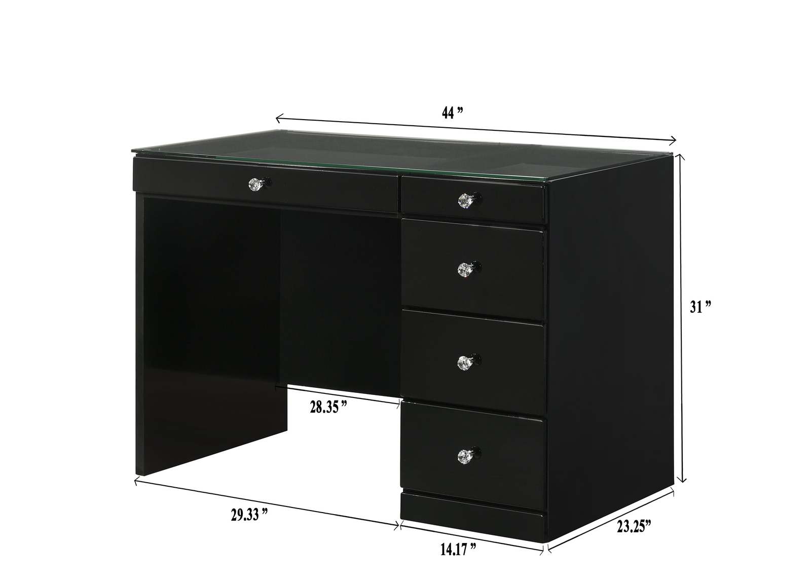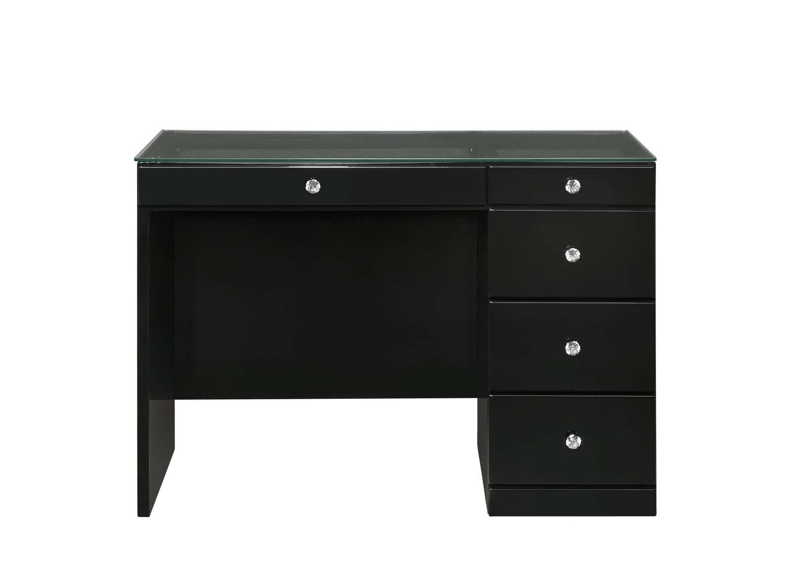 This exquisite vanity set is the epitome of modern elegance, offering a sleek, black finish that exudes contemporary sophistication. The spacious tabletop is adorned with a stunning, crystal-clear glass surface that invites an abundance of light, while providing ample room for beauty essentials. Each drawer, accented with sparkling, crystal-style knobs, glides out smoothly to reveal generous storage space for cosmetics and accessories. A plush, swivel stool tucks away neatly, providing comfort with a chic touch.