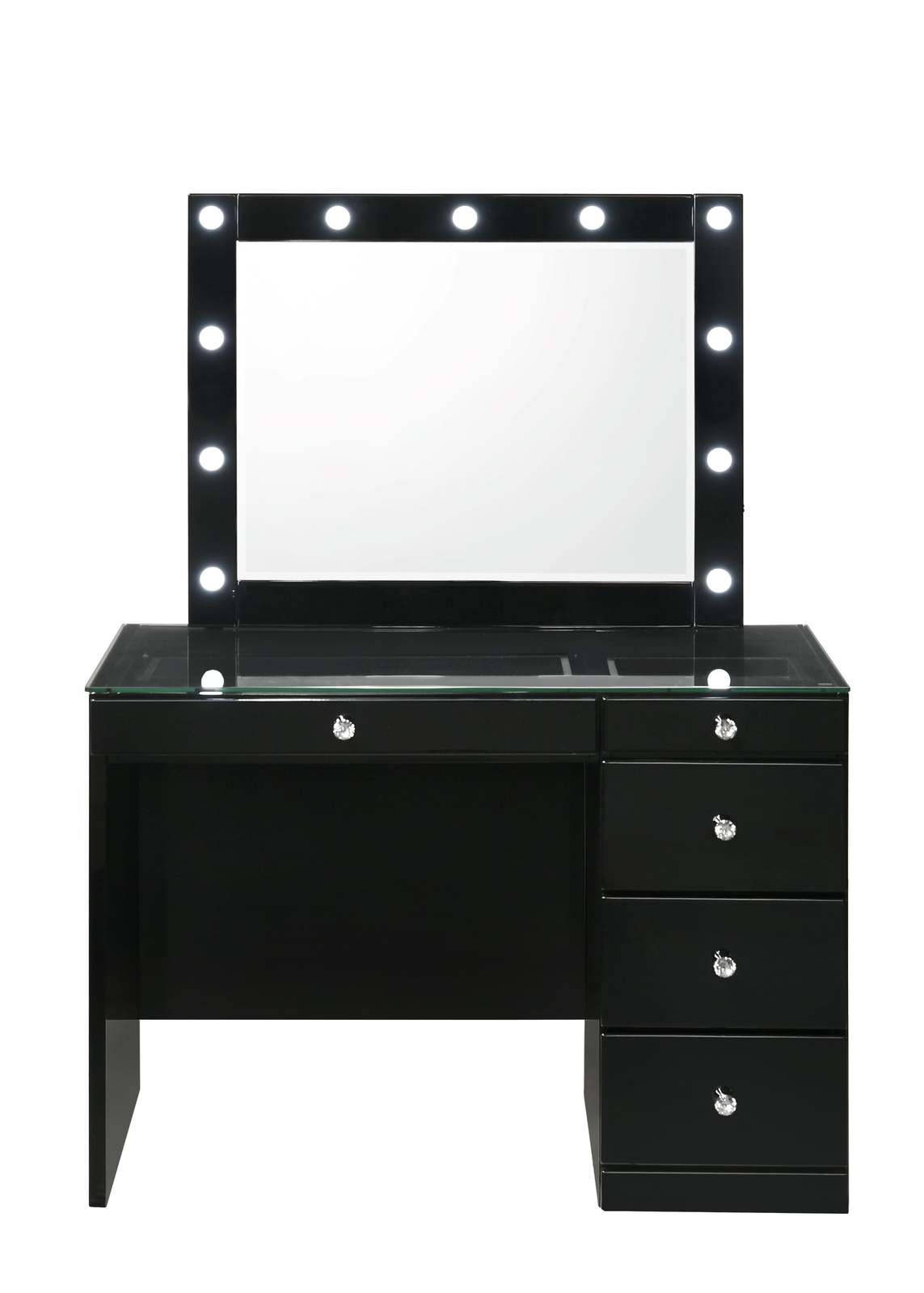 Black Makeup Vanity Set: LED Mirror, Glass Top, 5 Drawers, Crystal Knobs