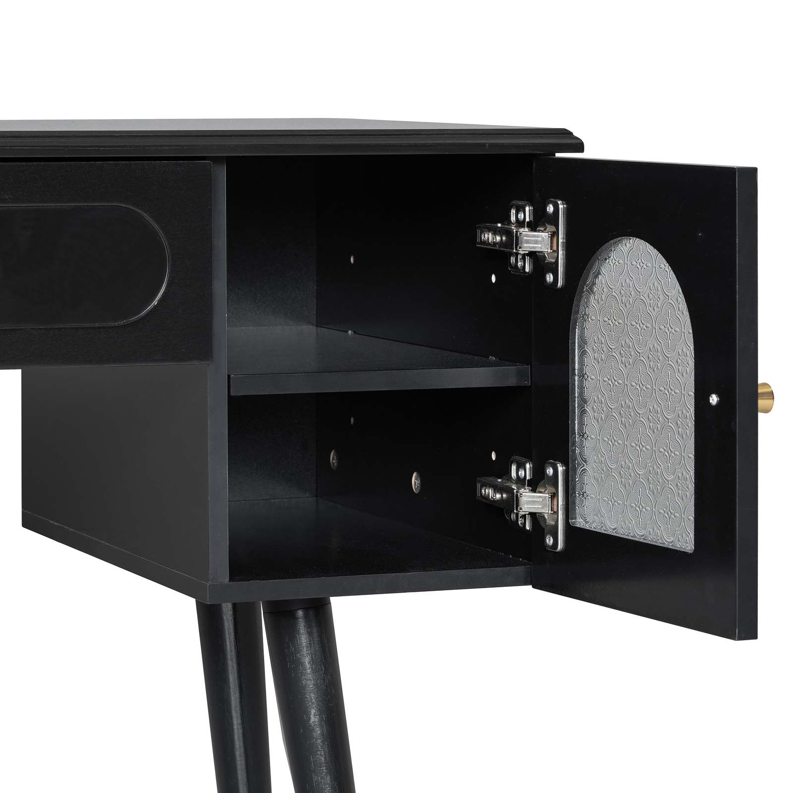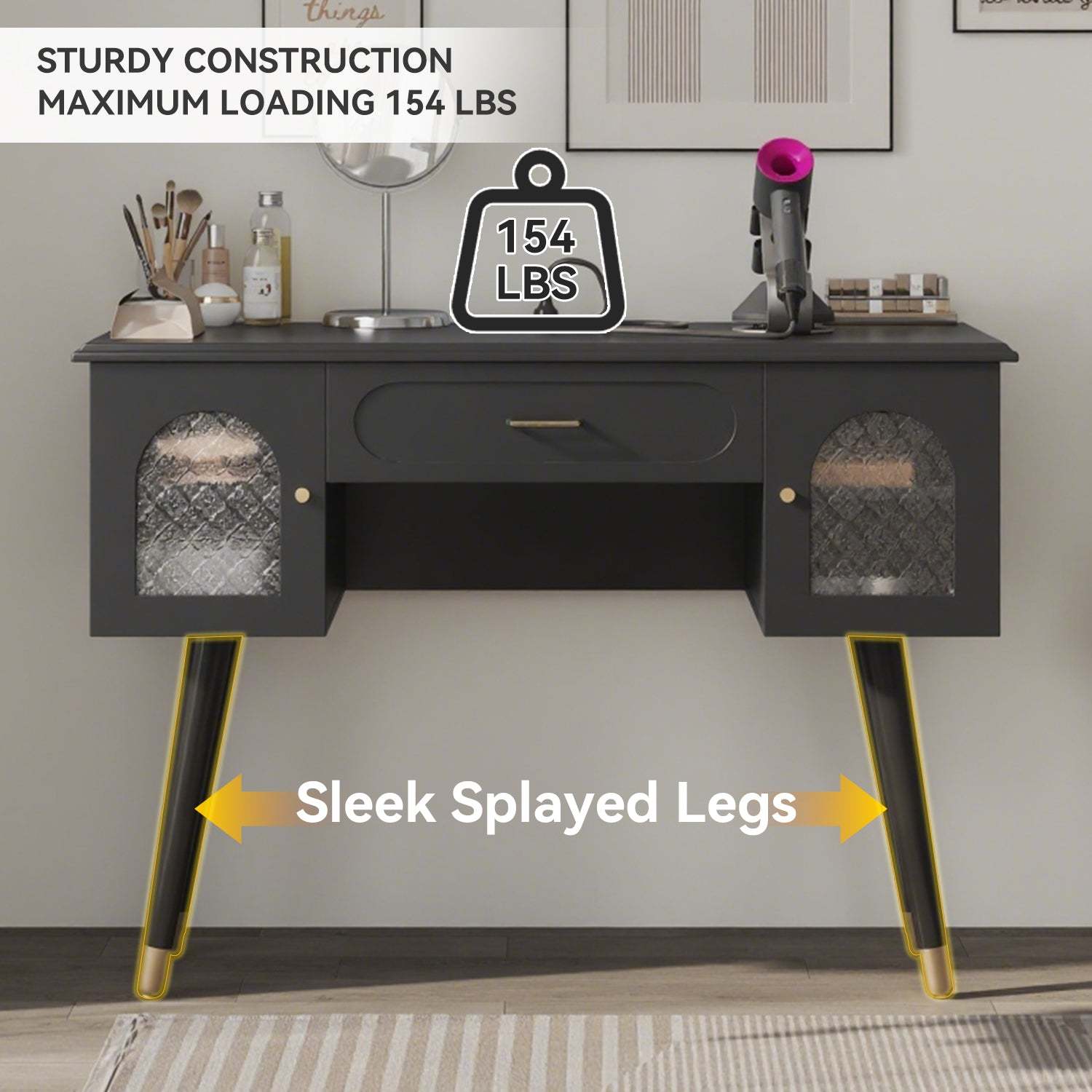 Ample Storage for Organization: Keep your space tidy and organized with this makeup desk?s spacious storage solutions. The wide tabletop, two large cabinets, and one smooth-gliding drawer with storage compartments offer ample space for your jewelry, cosmetics, and accessories. Easy-to-use slides ensure smooth operation, making it simple to access your items whenever you need them.