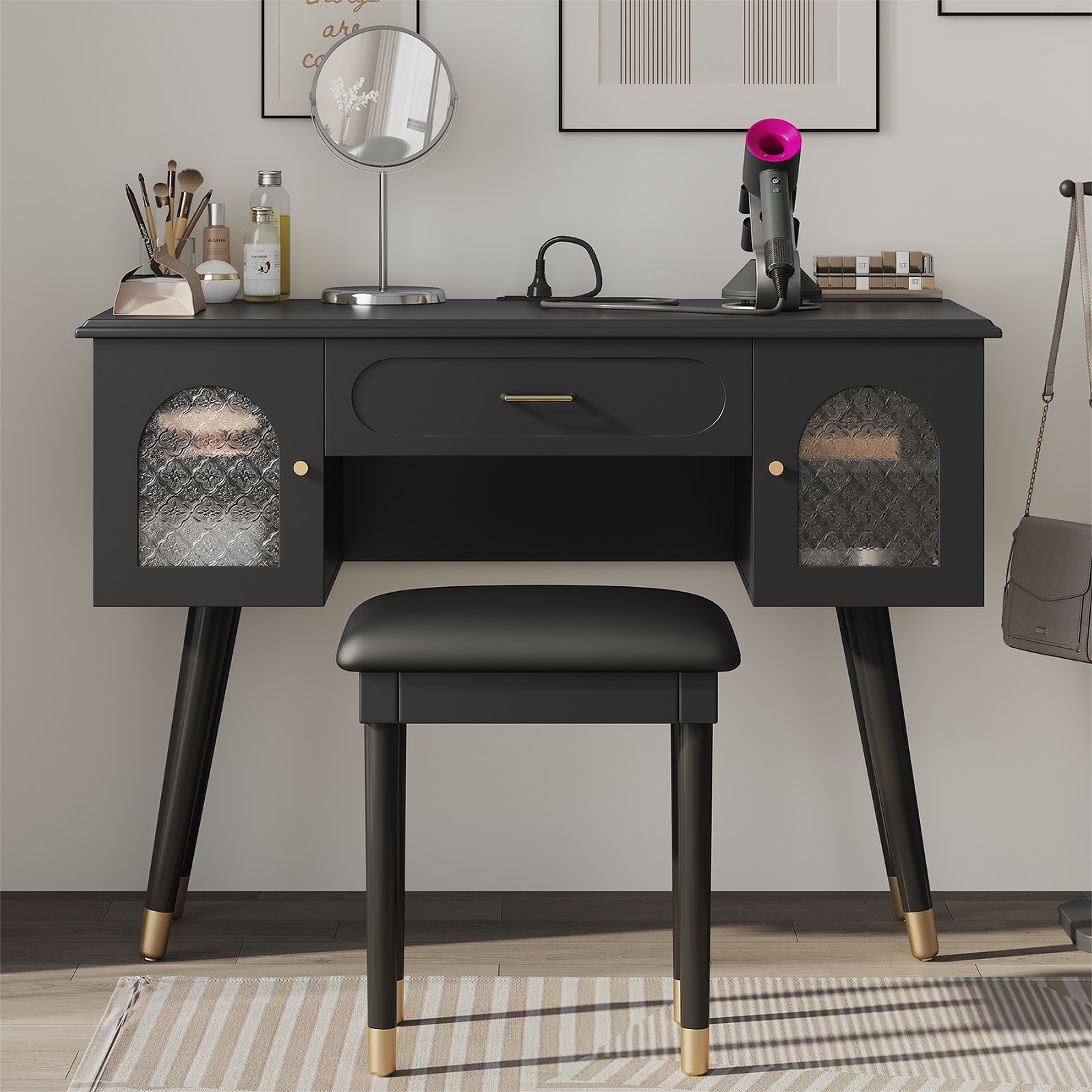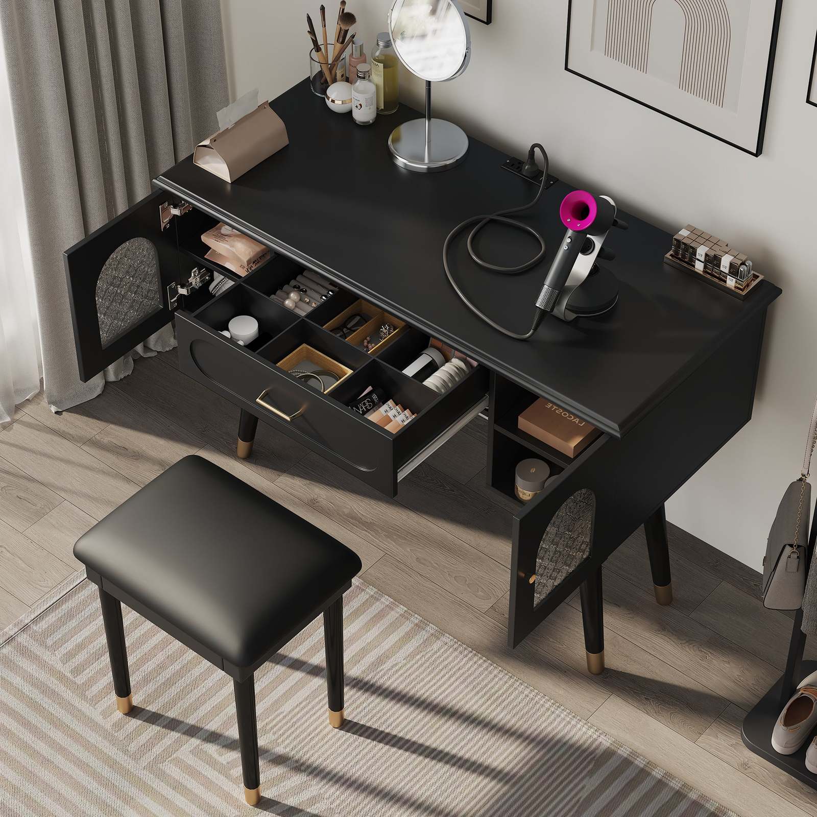 Elegant Black Vanity Table Set: Modern Makeup Desk, Organizer, Charging Port