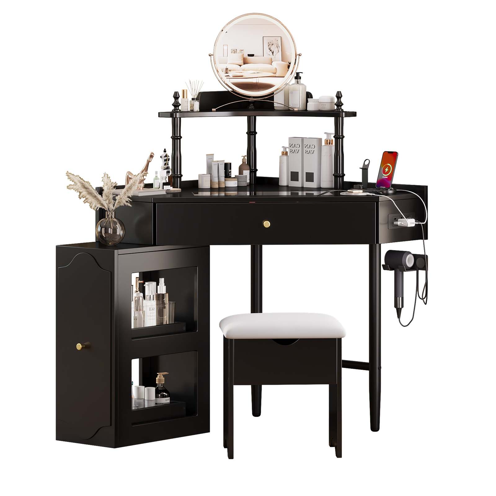 Black Corner Makeup Vanity Desk w/ Stool, Storage & Charging Station